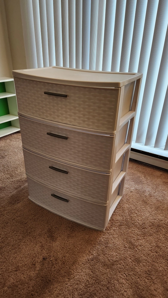 Like new, Sterilite four-drawer plastic dresser. Off-white colour. Wicker-style moulded plastic front, with dark grey handles.