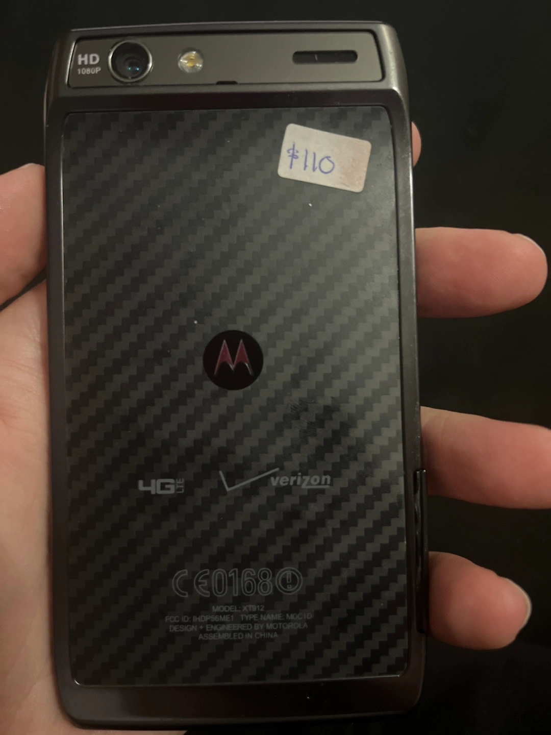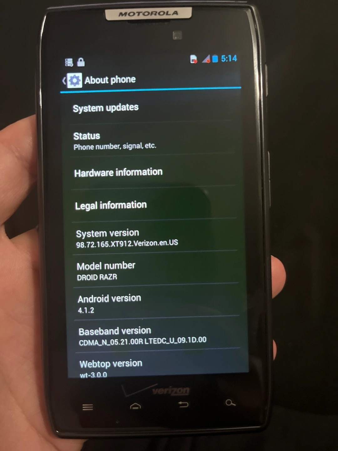 Vintage Motorola Droid RAZR smartphone. Verizon 4G LTE. Android 4.1.2. Includes pre-installed apps. Model XT912.