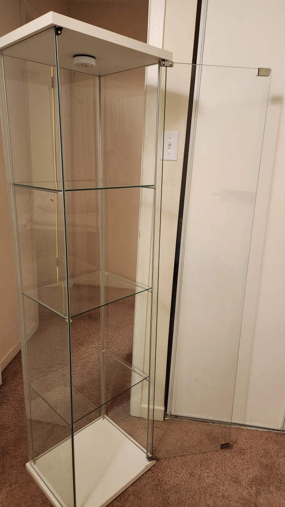 Ikea Detolf glass display cabinet, metal bar skeletal frame, with four glass shelves. White base and top. Hinged door. Great for collectibles or displaying items.