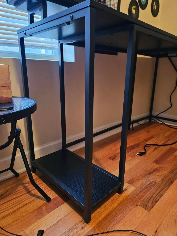 - Another thing to mention, the first picture Is for size reference, there are 2 differences from that picture and the actual desk. The rest of the photos show the actual desk. The shelf is just wood, not mesh. The top shelf do not connect like it shows in the first picture