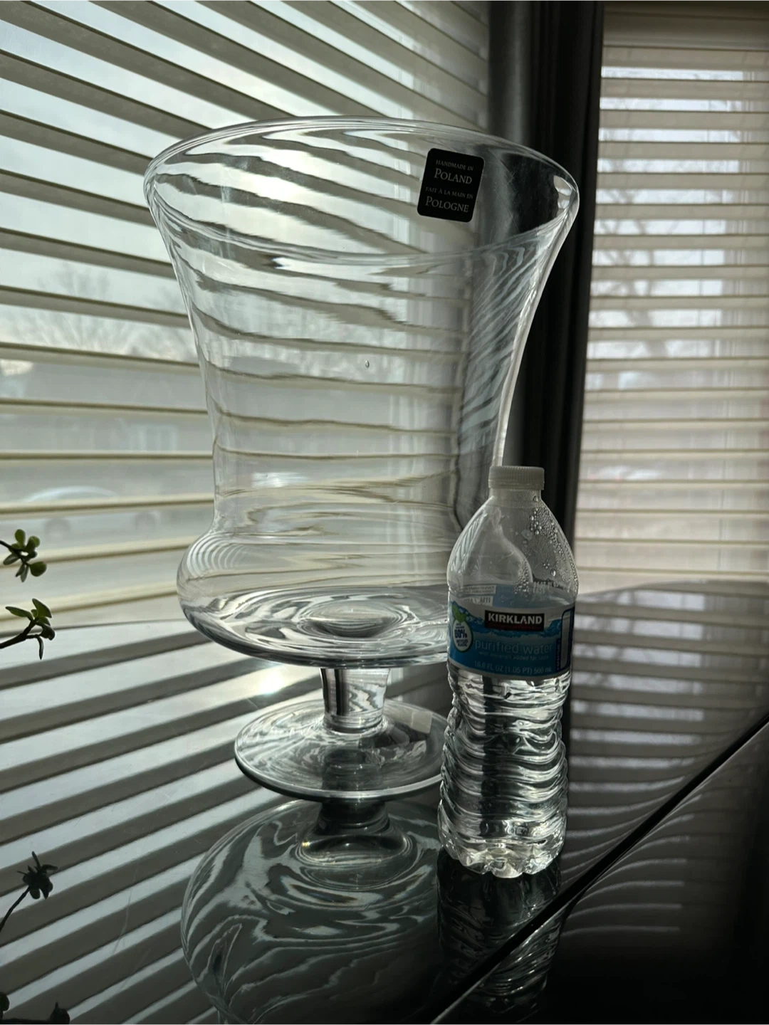 This is a large, clear glass vase. It's handmade in Poland. Perfect for displaying a large bouquet of flowers!