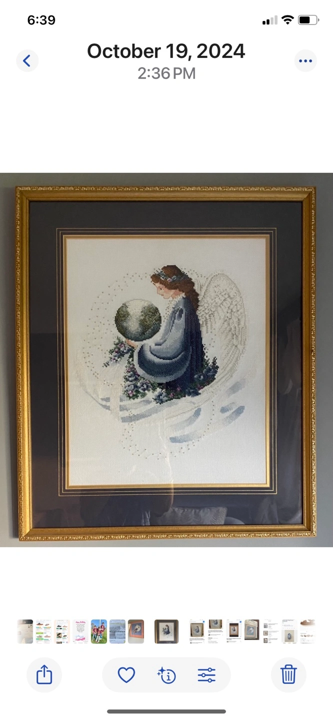 Professional Framed Cross Stitch Angel w/ Earth/Flowers