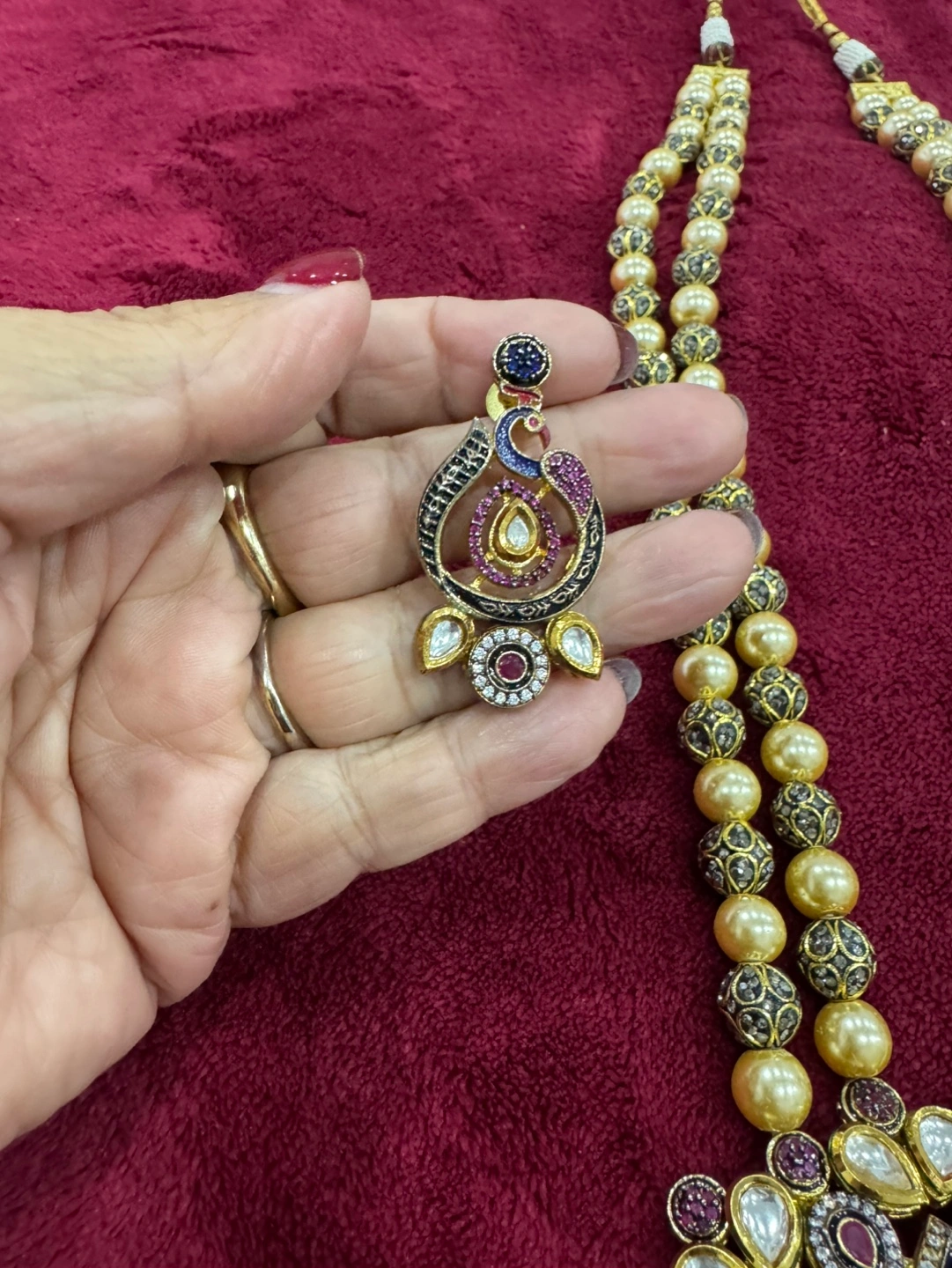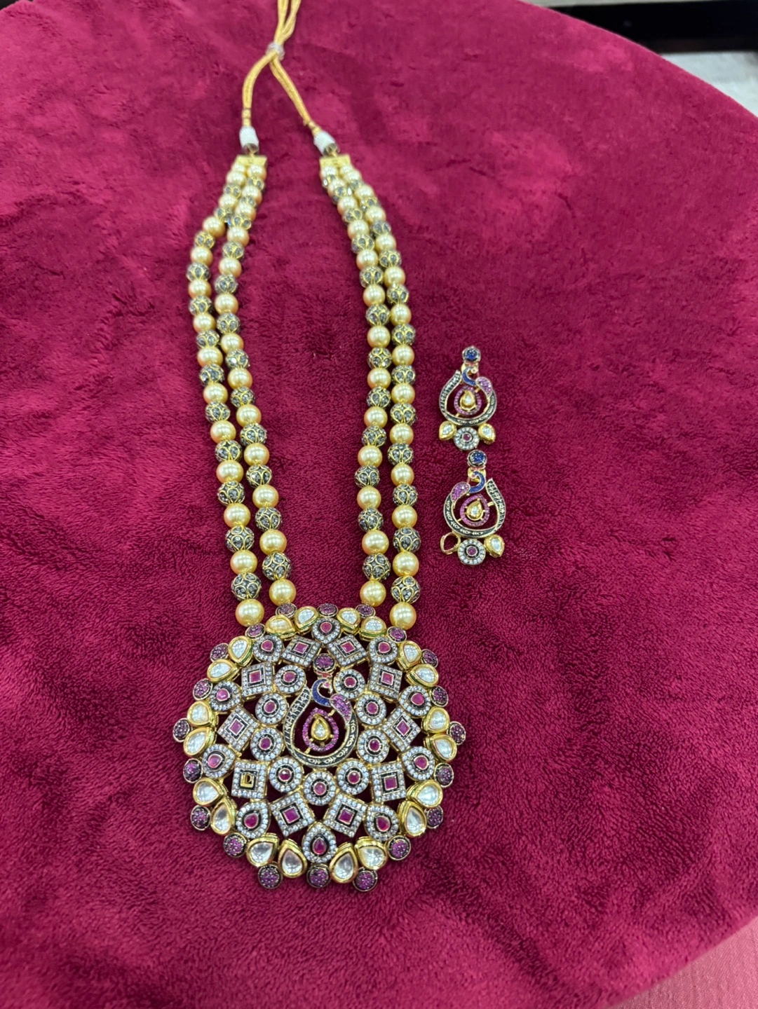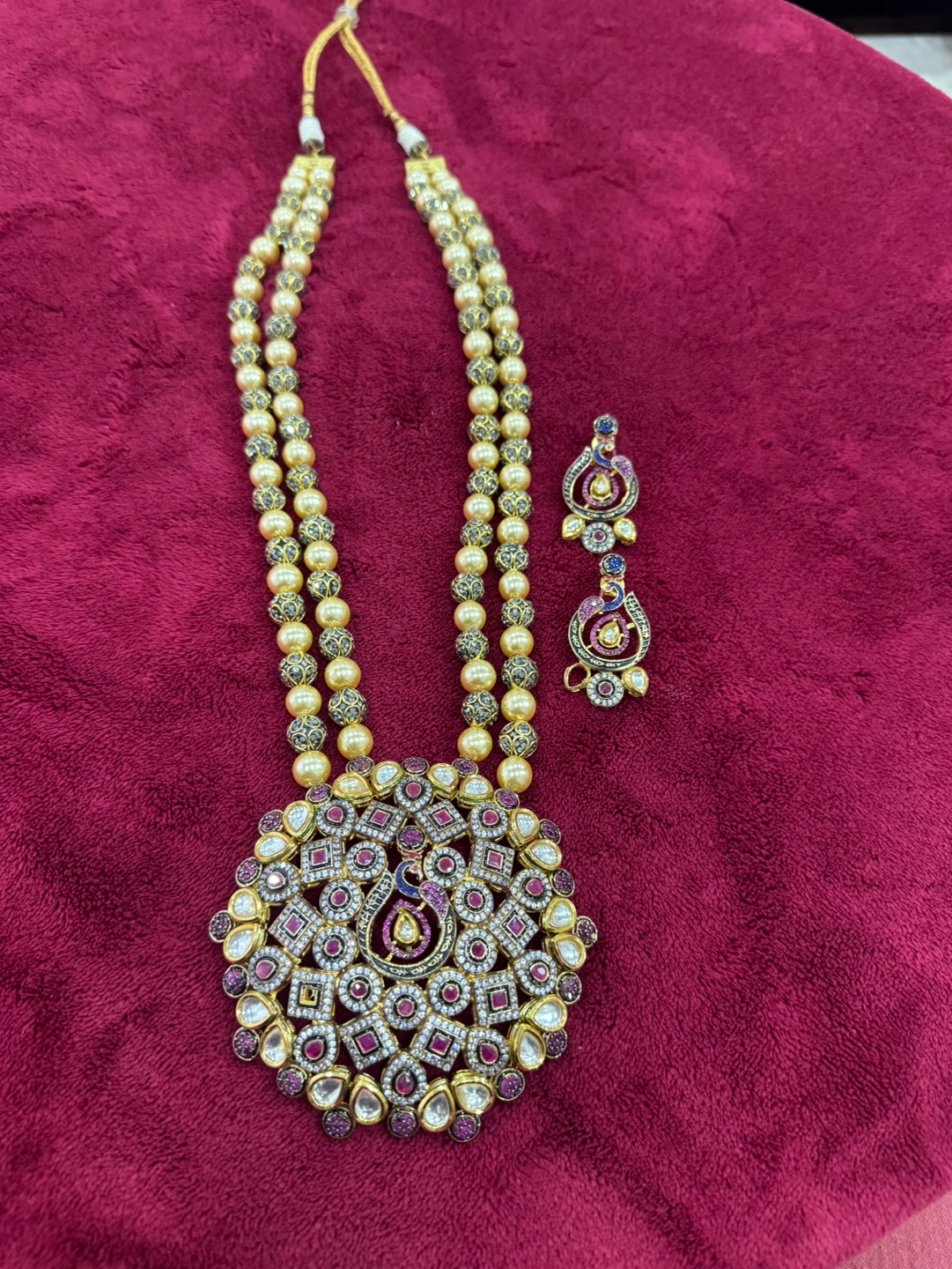 Beautiful necklace set. Features a large, ornate pendant and matching earrings. Multicoloured stones, pearls, and gold-toned accents. Elegant and eye-catching.