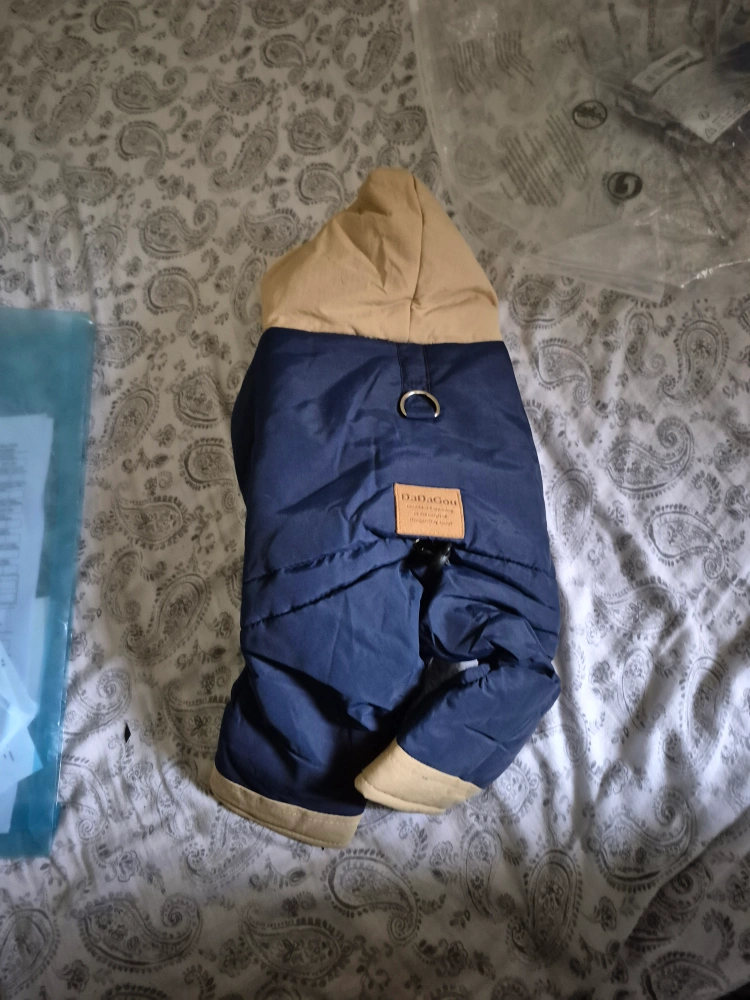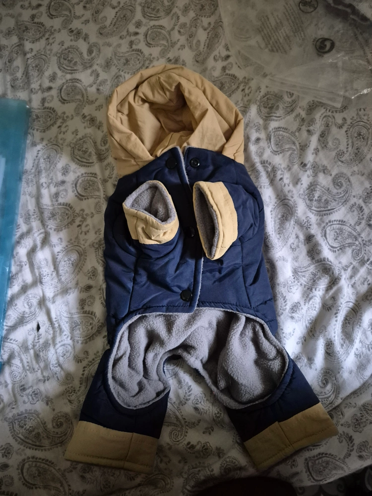 Adorable winter jacket for small dogs. Features a hooded design, two legs, and a soft fleece interior. Keeps your furry friend warm and cozy during cold weather. Machine washable for easy cleaning.