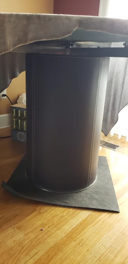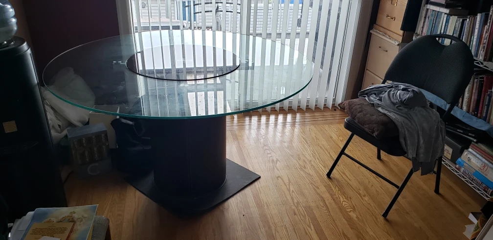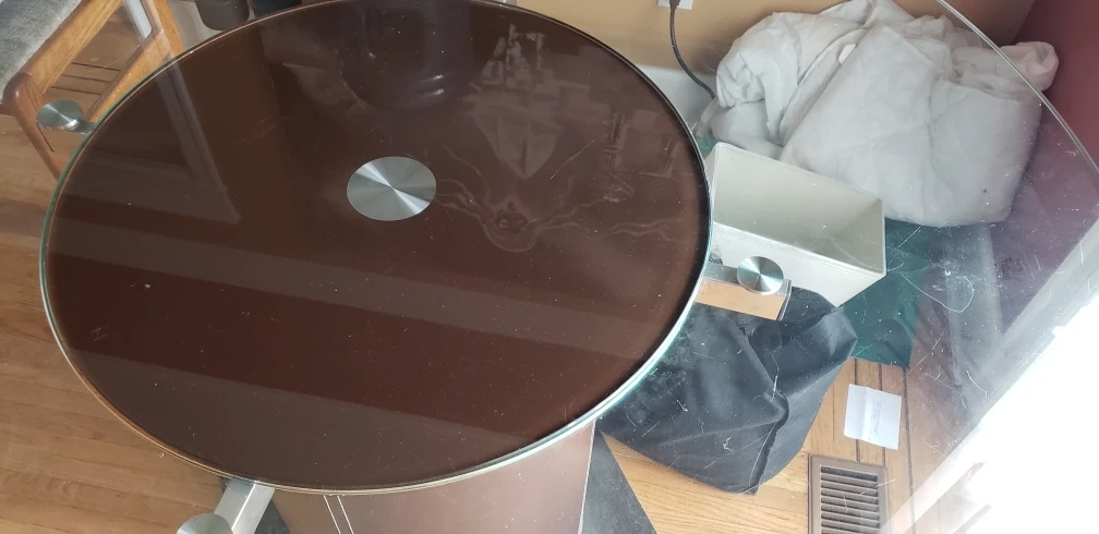 Round glass tabletop. Dark brown pedestal base. Rotating top middle. unique, one of a kind kitchen table or craft table, etc. Some minor wear.