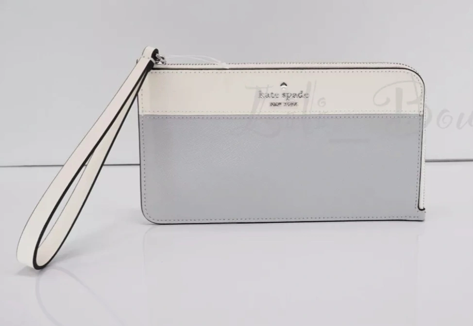 NWT Beautiful Kate Spade New York wristlet. Grey and white colourblock design. Features a wrist strap and zip closure.