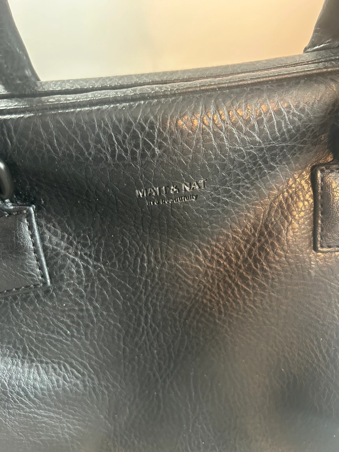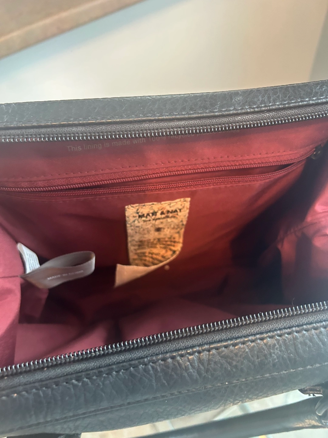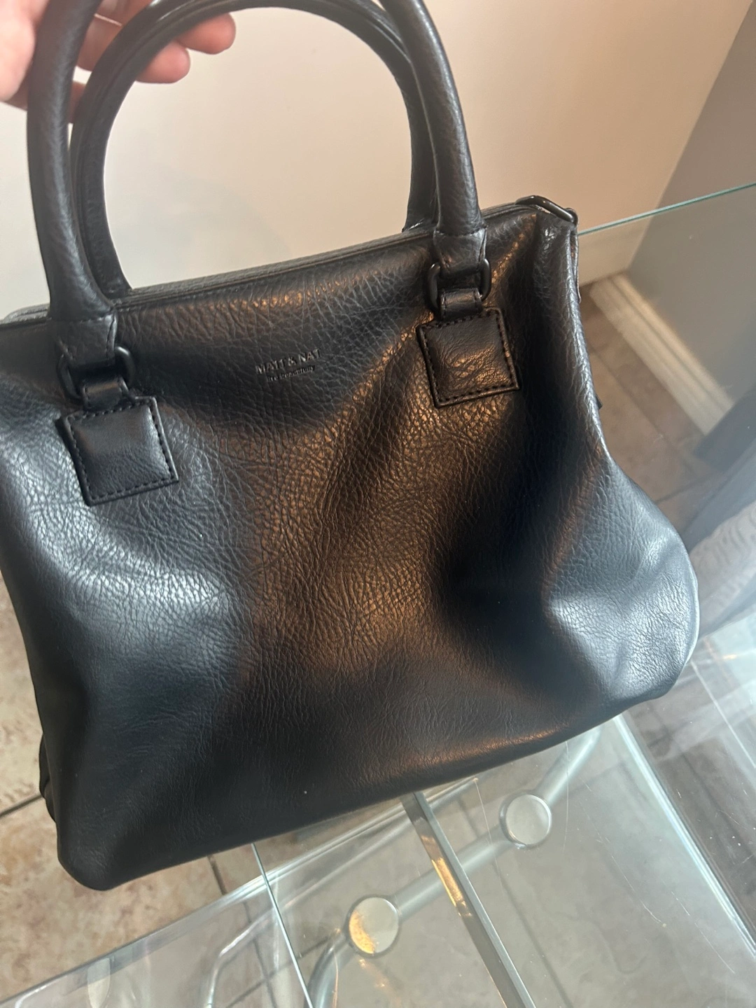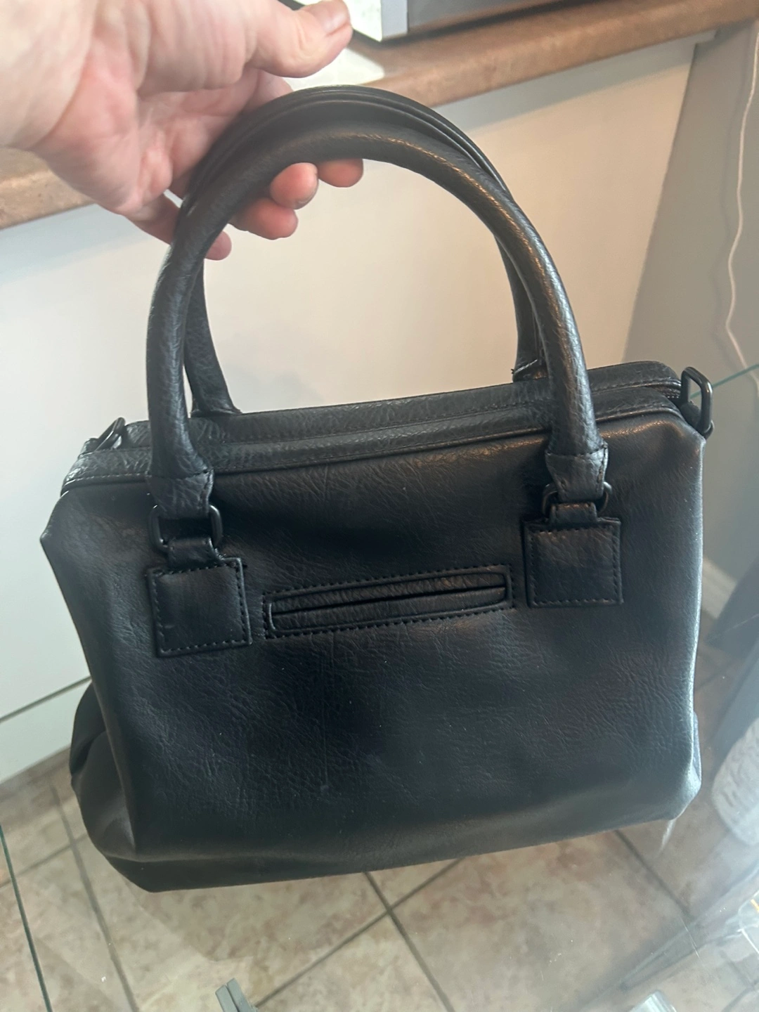 Large black handbag. Vegan leather. Top handles. Zip closure. Interior pocket. Very good condition; could double as Baby Bag.