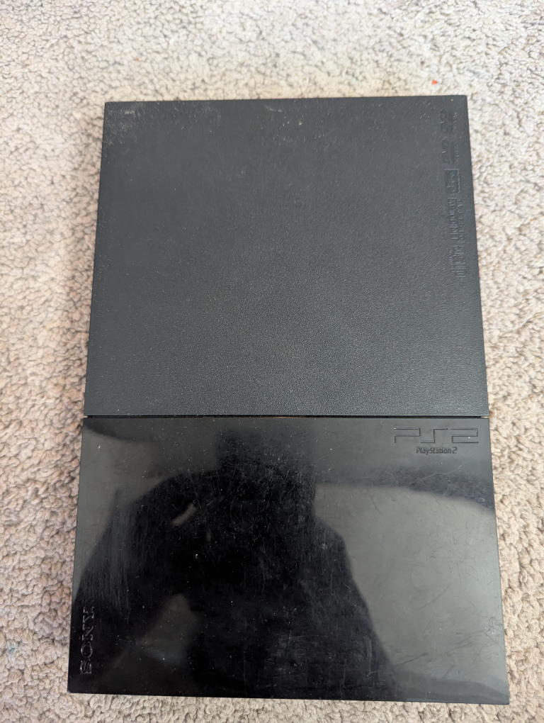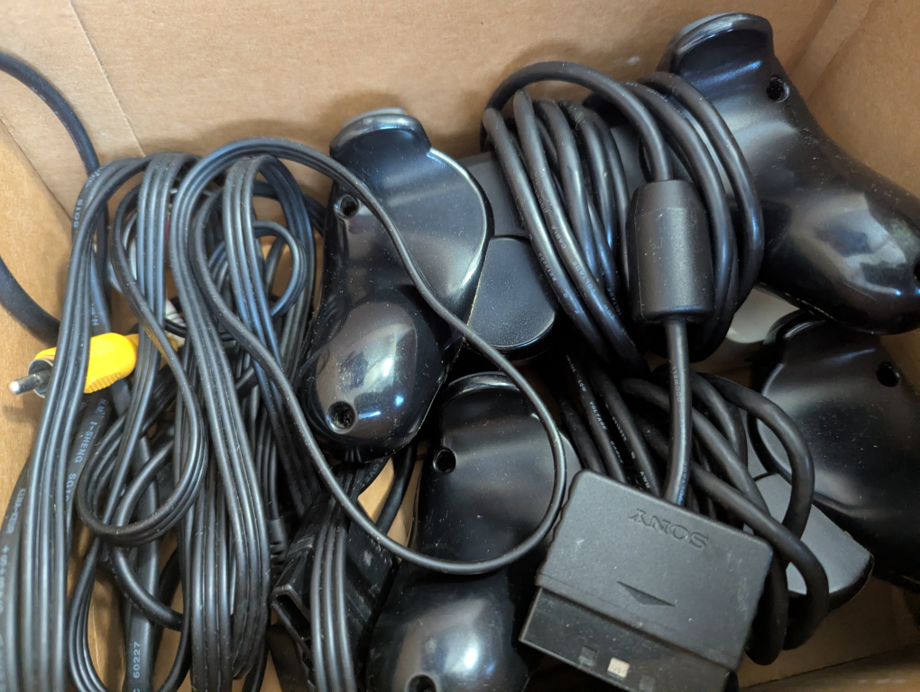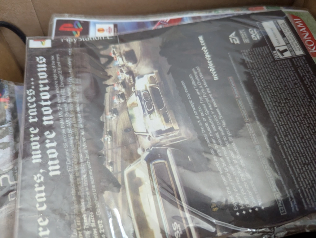 PlayStation 2 console, multiple controllers and cables included. Need for Speed: Underground 2 game also included. Pre-owned, shows some wear.
