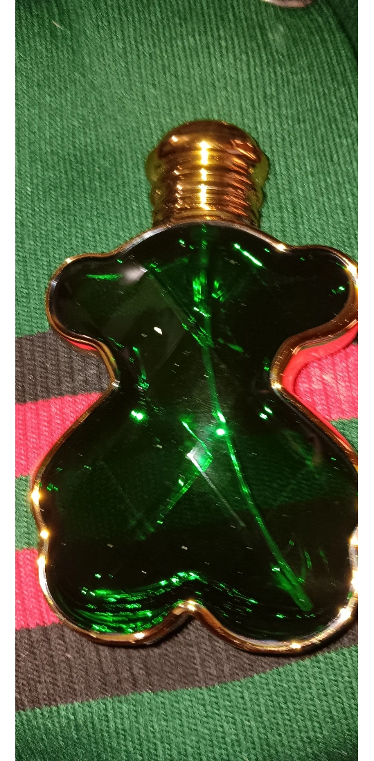 10Unique green glass perfume bottle. Gold accents. Bear shaped. Collectible.