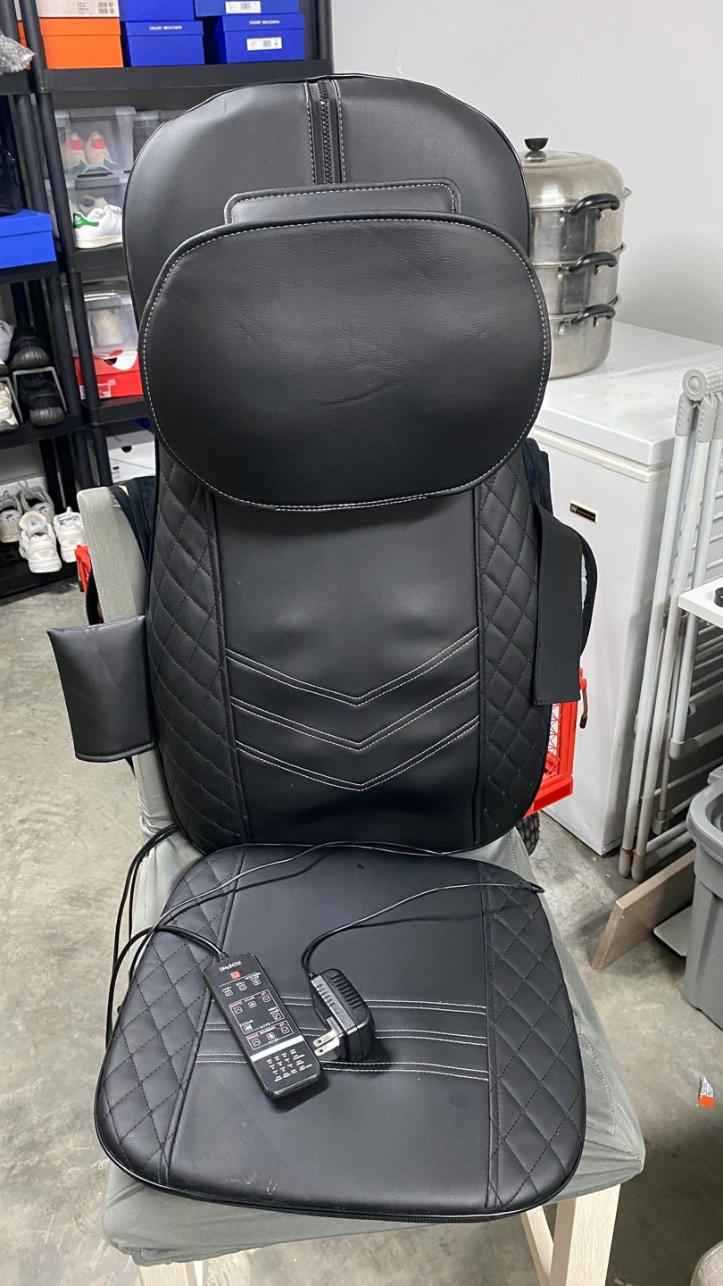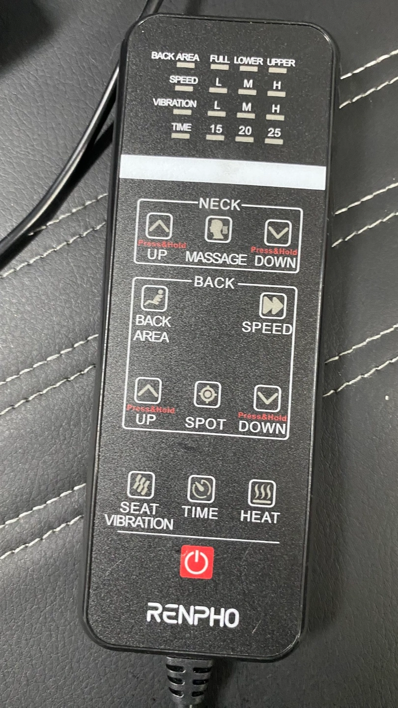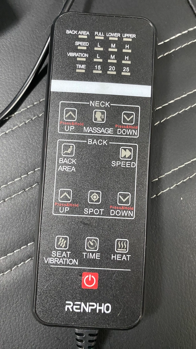 Remote control for neck and back massage. Features shiatsu massage, rolling massage, heat, and adjustable settings. Excellent for relieving muscle tension and promoting relaxation.