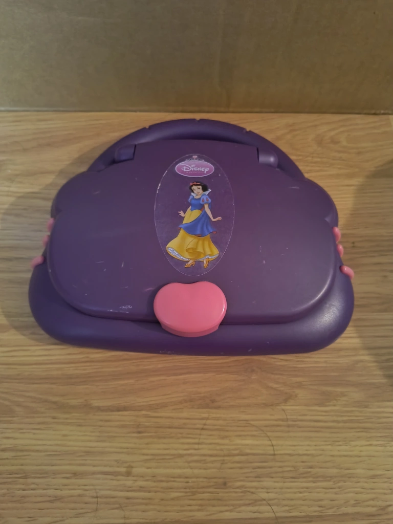 Vintage Snow White themed children's toy laptop. Features a screen, buttons, and sound.