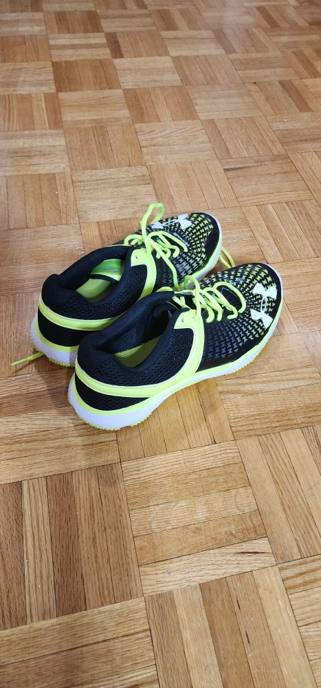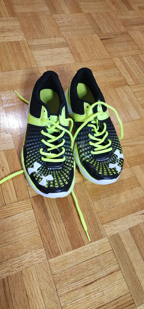 Pair of used Under Armour running shoes. Black and neon yellow. Good condition. Laces included.