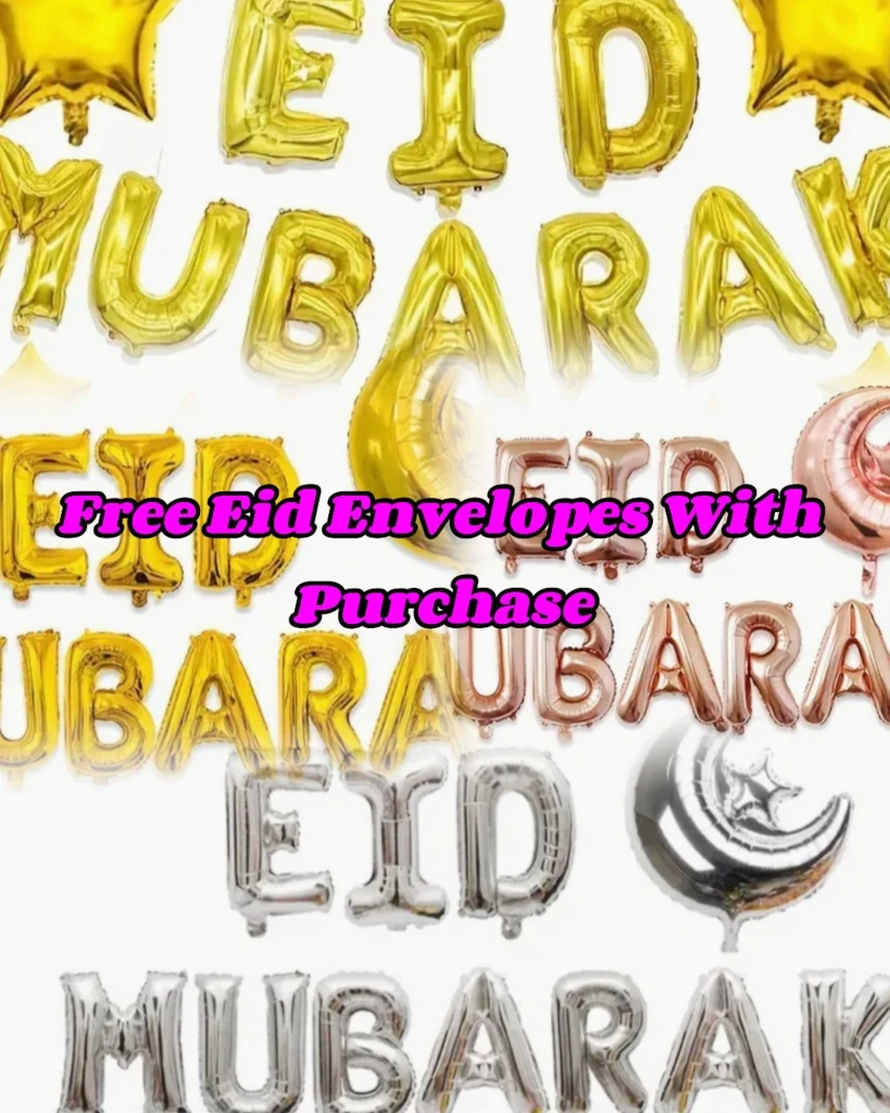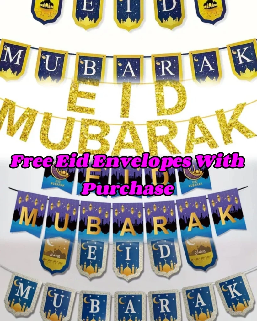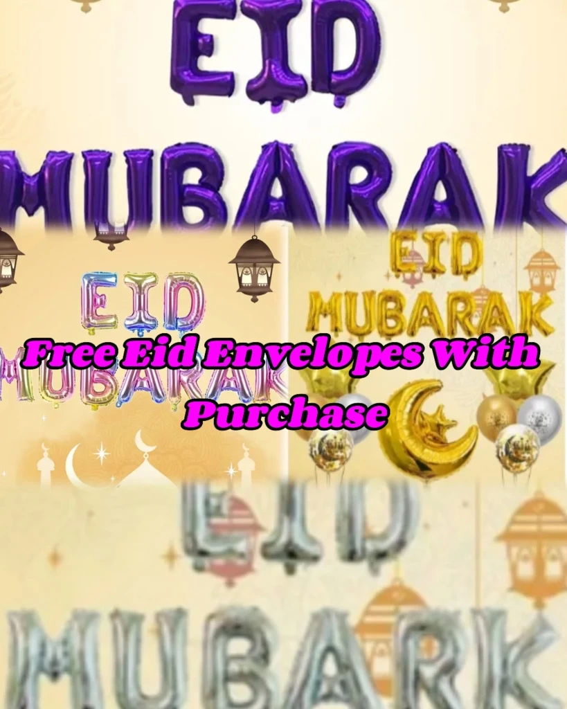 Gold, rose gold, silver and purple foil balloons. Letters spell out Eid Mubarak. Includes various banner styles. Free Eid envelopes with purchase.