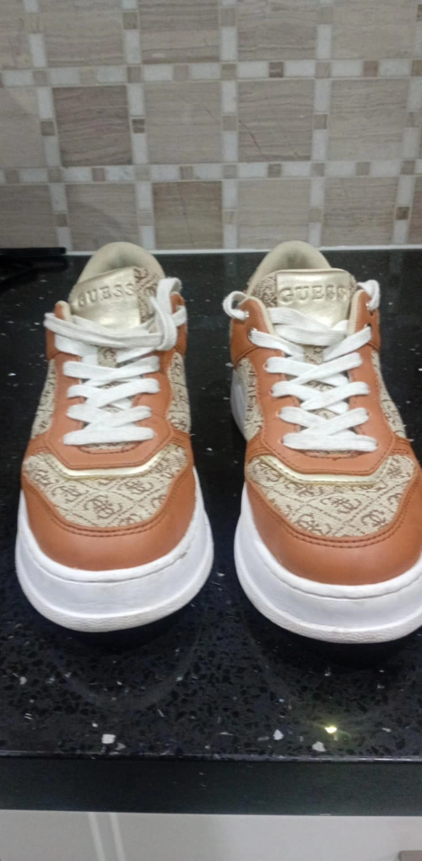 Brown and beige platform sneakers. Lace-up closure. Features Guess logo throughout. Women's size 7. Made in Vietnam.