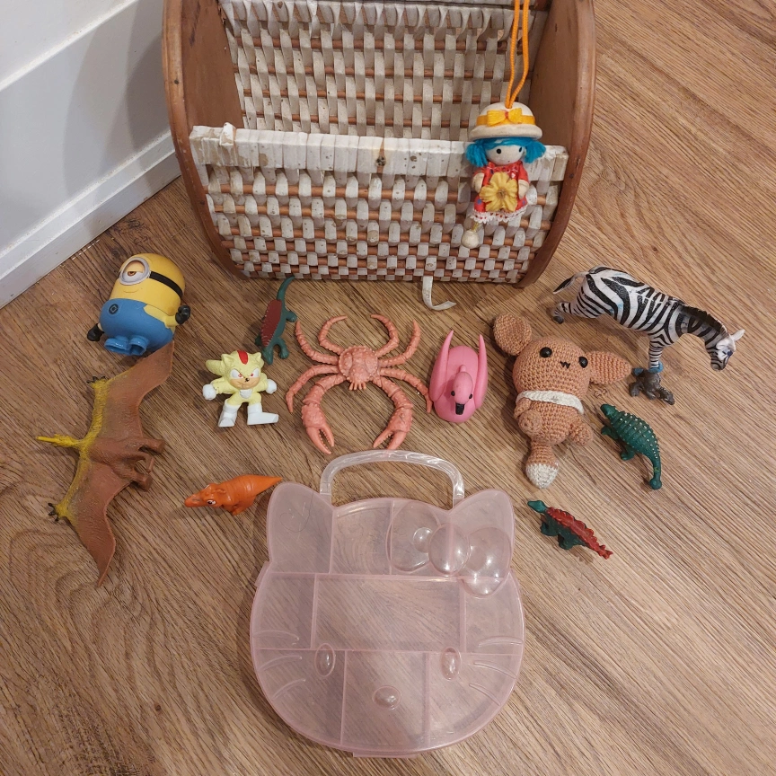 Collection of small figurines including a Minion, Sonic the Hedgehog, dinosaurs, a crab, flamingo, zebra, and more. Comes with a hello kitty storage case. Perfect for kids and collectors or imaginative play.