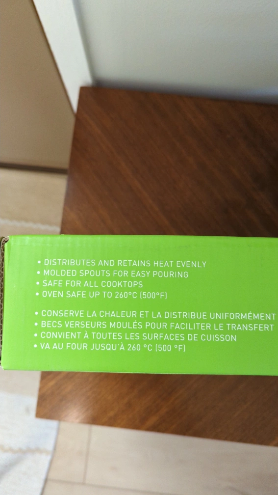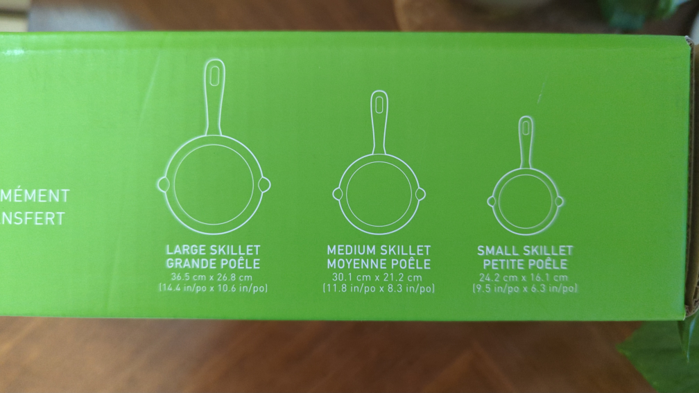 Pre-seasoned cast iron skillets. Great for stovetop, oven and barbecue. Distributes and retains heat evenly. Molded spouts for easy pouring. Safe for all cooktops up to 260°C (500°F). Includes large, medium and small skillets. Never been used, still new in box