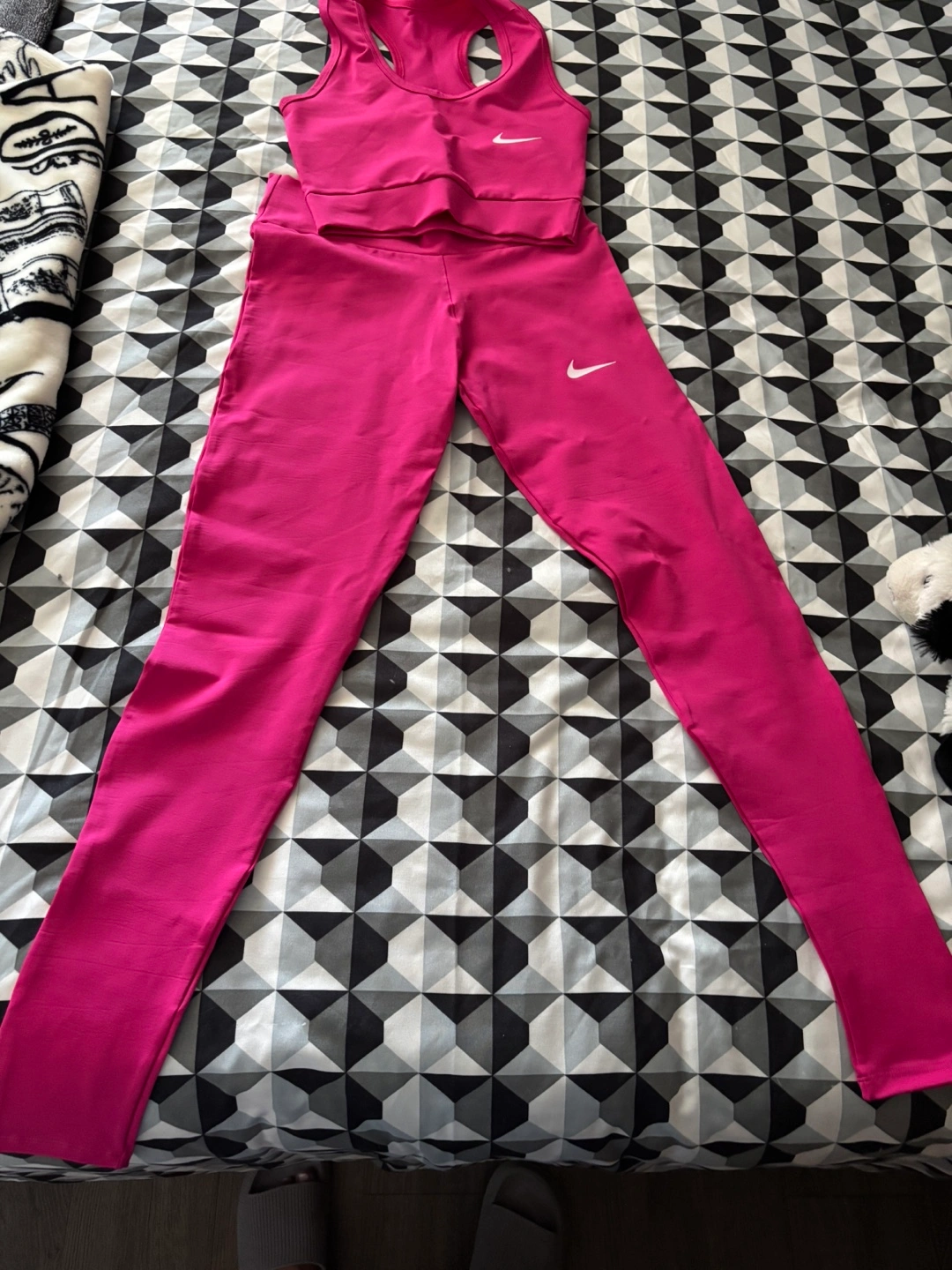 Women's workout set. Includes hot pink leggings and matching cropped sports bra. Nike logo visible on both pieces. Great for exercise.