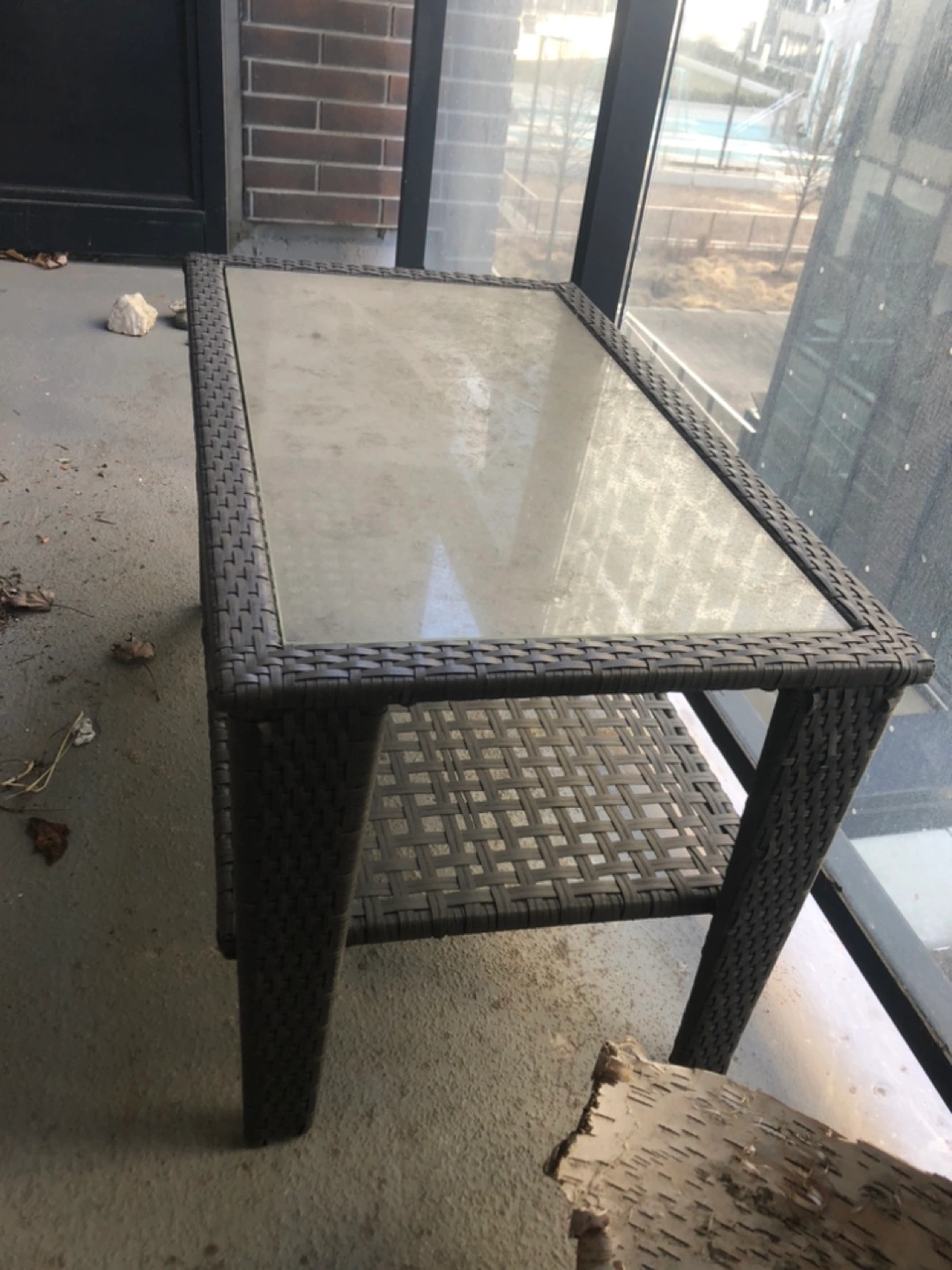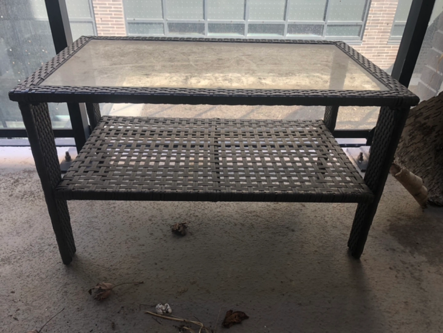 Small patio table, with a sturdy dark grey wicker frame. Glass top with a shelf. Great for small spaces