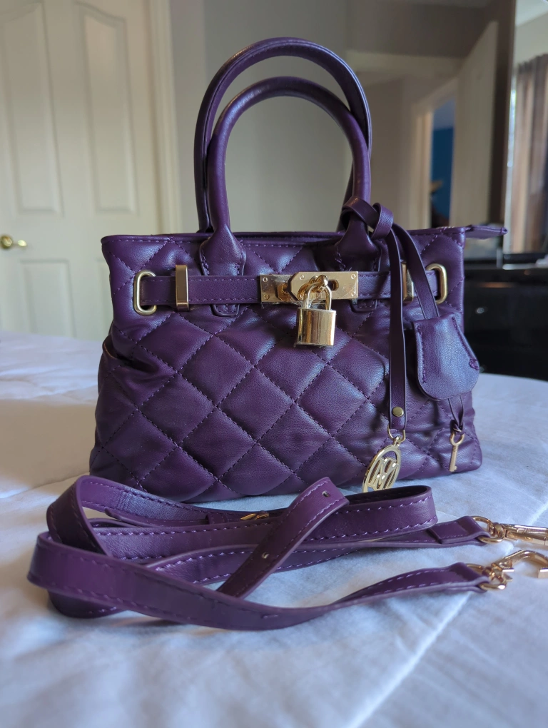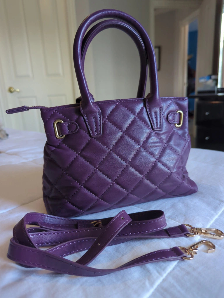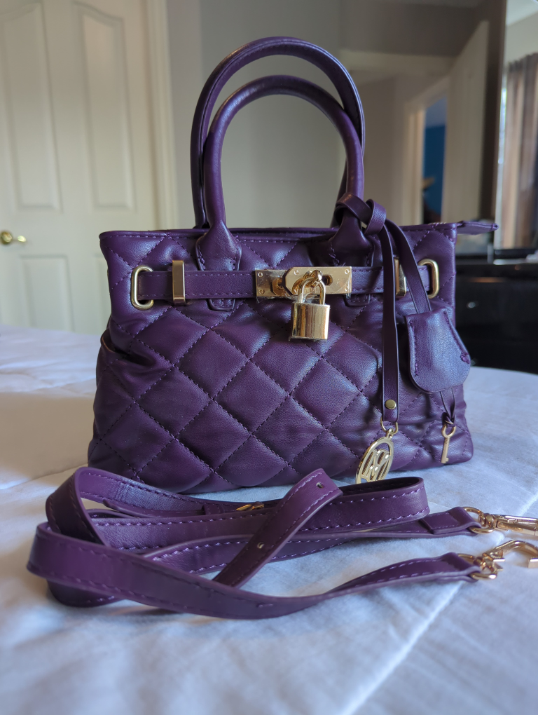 Gorgeous purple quilted vegan leather handbag. Features gold-toned hardware, top handles, and a detachable shoulder strap. Lock closure with key. Small size, perfect for everyday use. Never used.