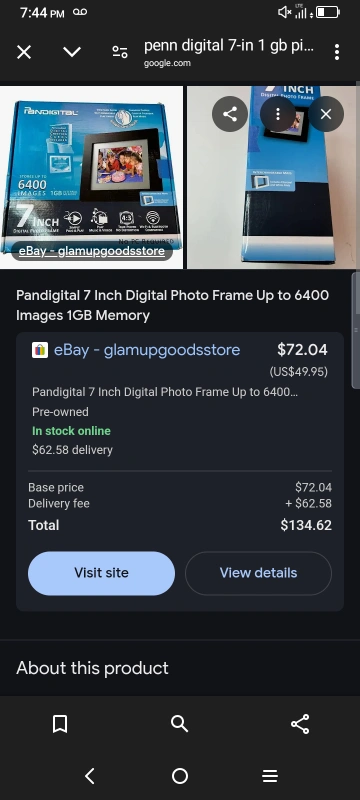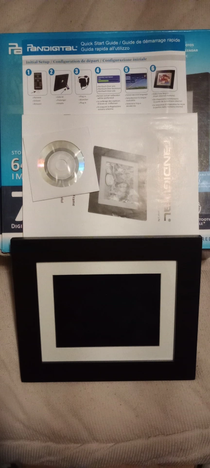 7-inch LED digital photo frame. Black. Stores up to 6400 images. 1 GB memory. Includes quick start guide and CD. Excellent condition.