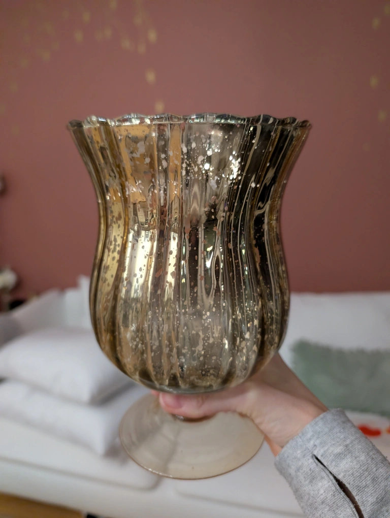 Elegant gold glass vase. Features a fluted design and a wide bowl. Perfect for displaying flowers or as a decorative centerpiece.