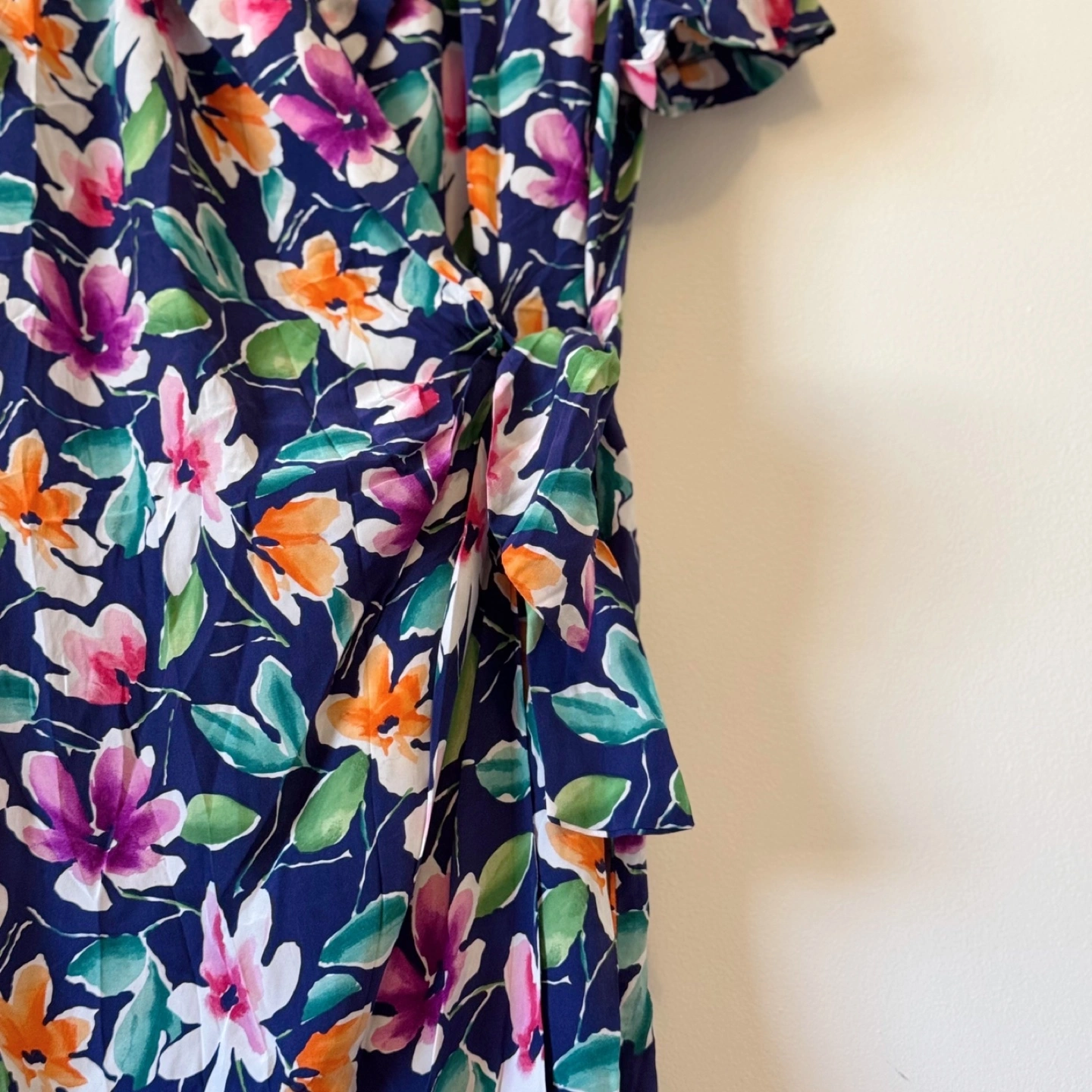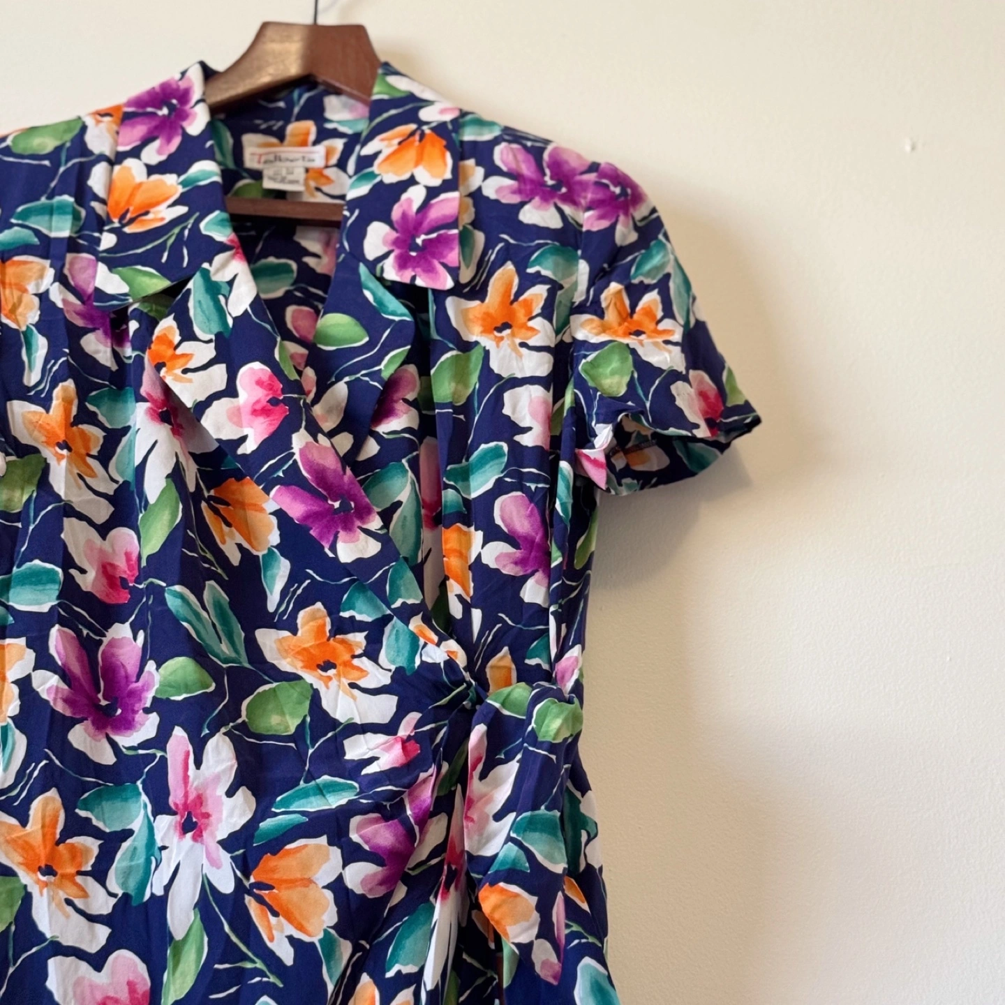 A vibrant vintage wrap dress with a bold floral print in purples, oranges, greens, and pinks on a rich navy background. Made of 100% silk, this dress features a flattering V-neckline, short sleeves, and a feminine waist tie that highlights your silhouette. Perfect for spring picnics, garden parties, or simply adding a splash of color to your day.
