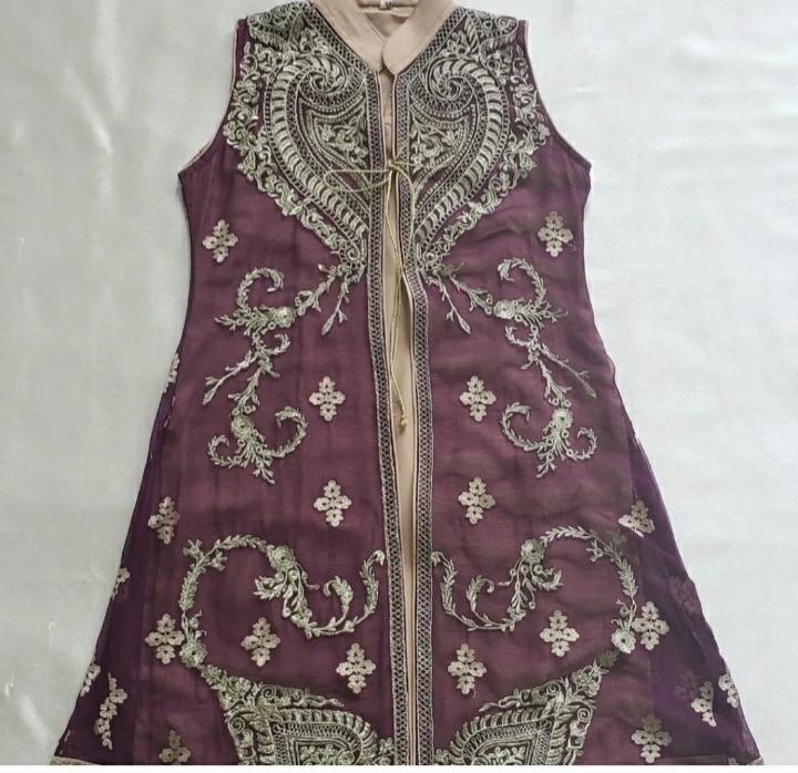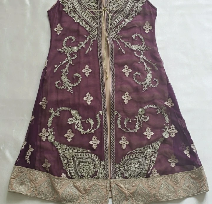 • Semi formal purple and gold gown style outfit fully embroidered with golden zari thread.