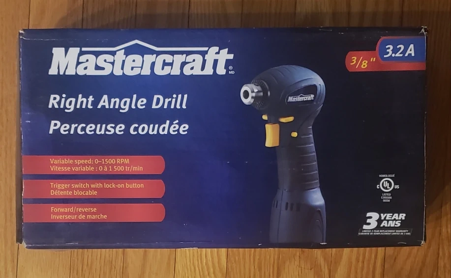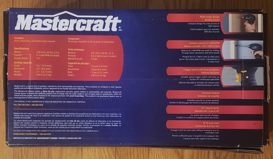 New Mastercraft right angle drill. 3/8" chuck. Variable speed 0-1500 RPM. Trigger switch with lock-on button. Forward and reverse. Includes drill, chuck key, and instruction manual.