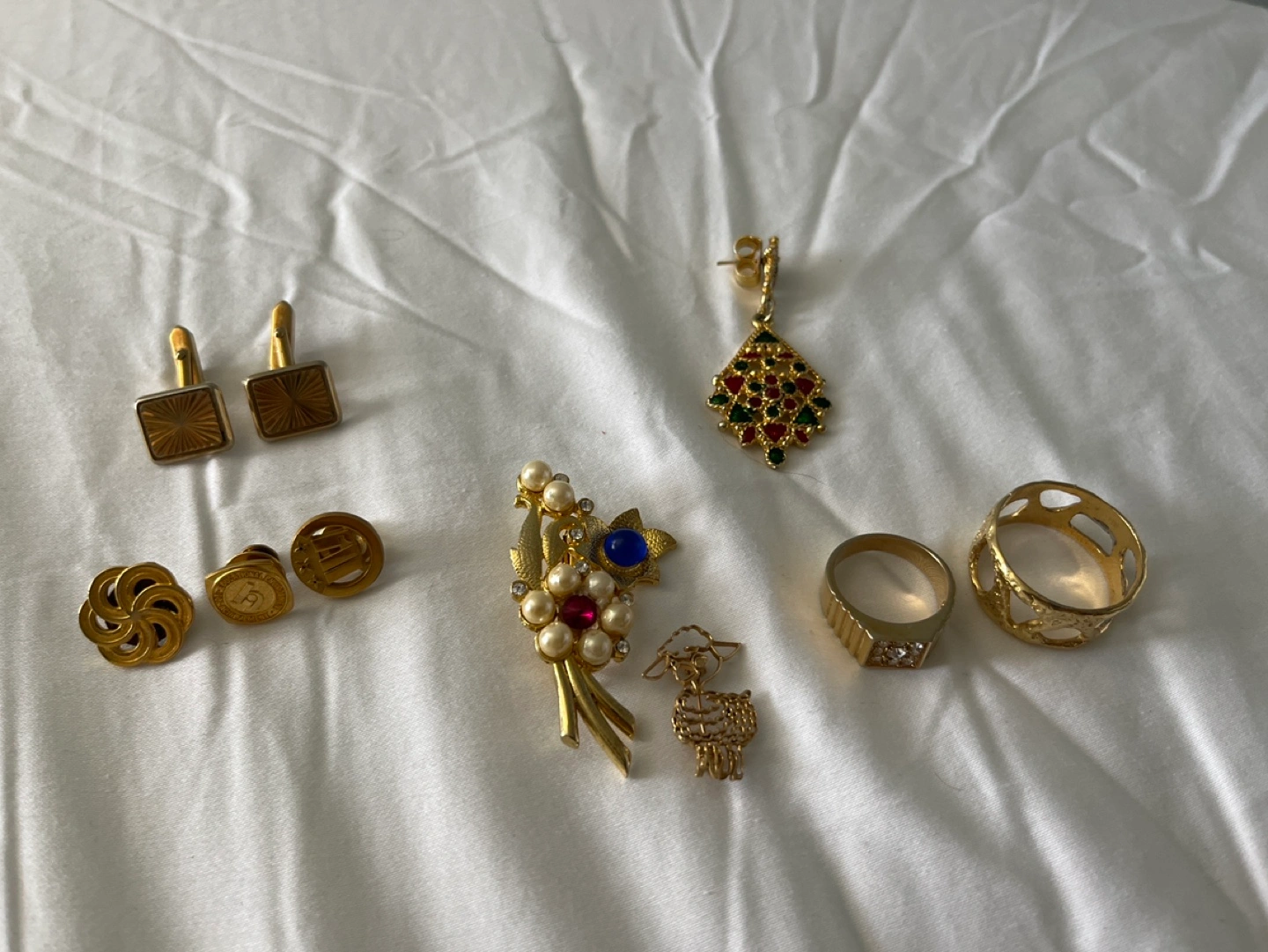 Collection of vintage gold-tone jewellery. Includes two pairs of cufflinks, two rings, two brooches, and one of dangling earring. Various designs and embellishments. Perfect for collectors or fashion enthusiasts.
