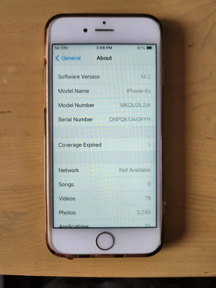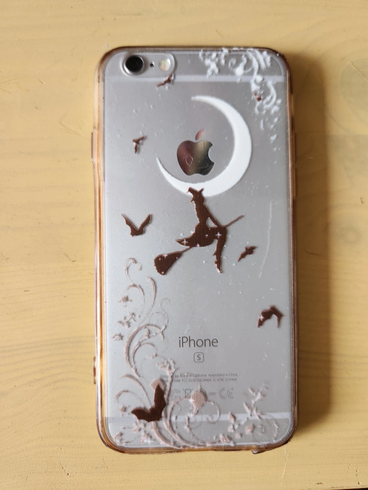 Used iPhone 6s, silver. 16 GB storage. iOS 14.2. Includes a Halloween-themed phone case.