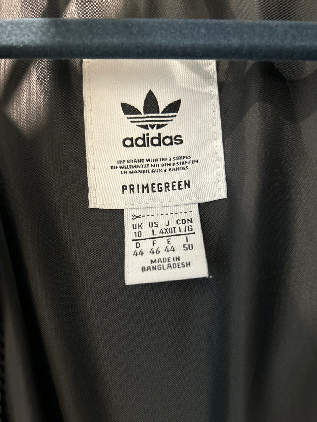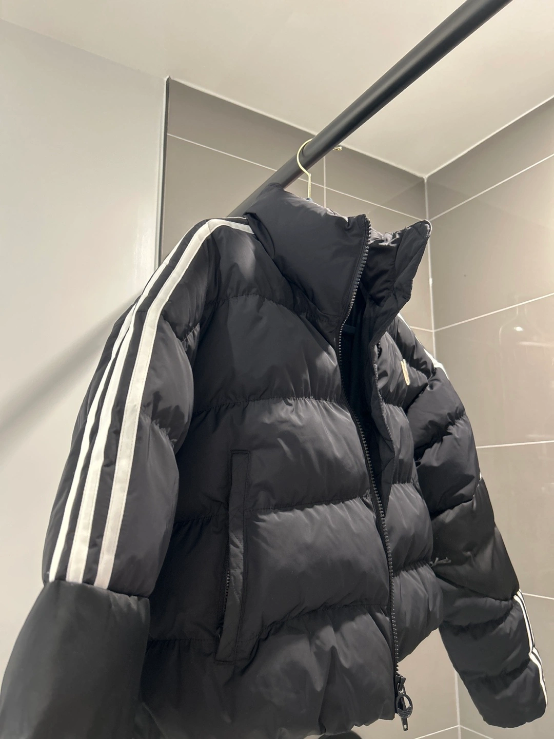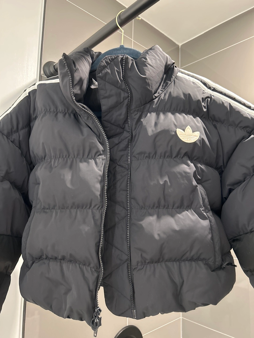 Black cropped puffer jacket. Features three white stripes on the sleeves and Adidas logo. Zip closure. Size Large.