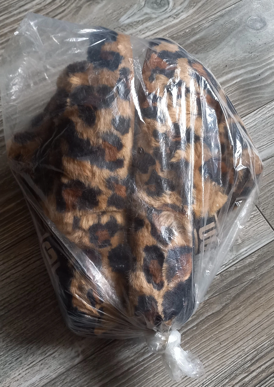 Cozy leopard print slides. Soft and fluffy. Great for lounging around the house. Black straps with UGG logo.
