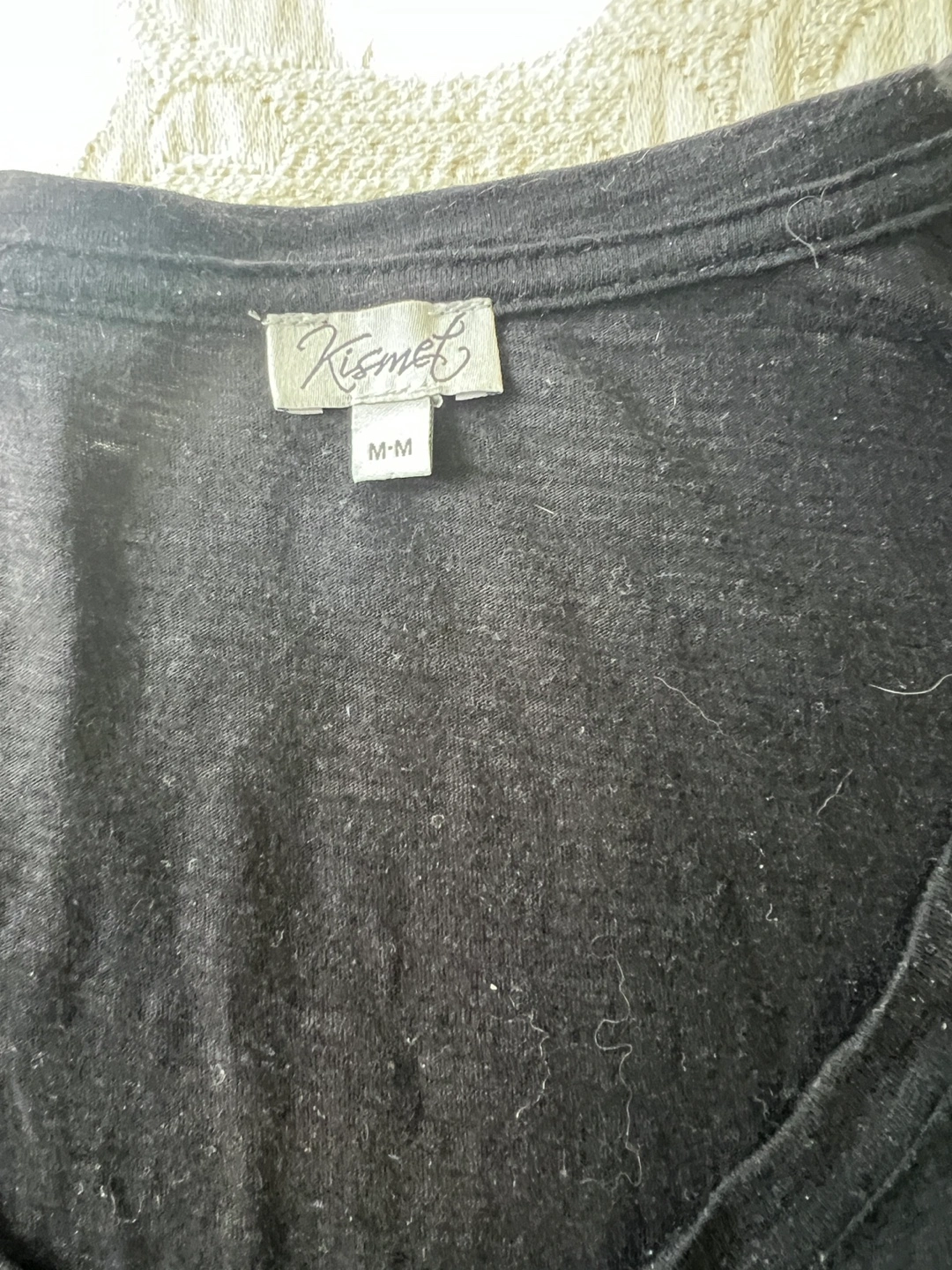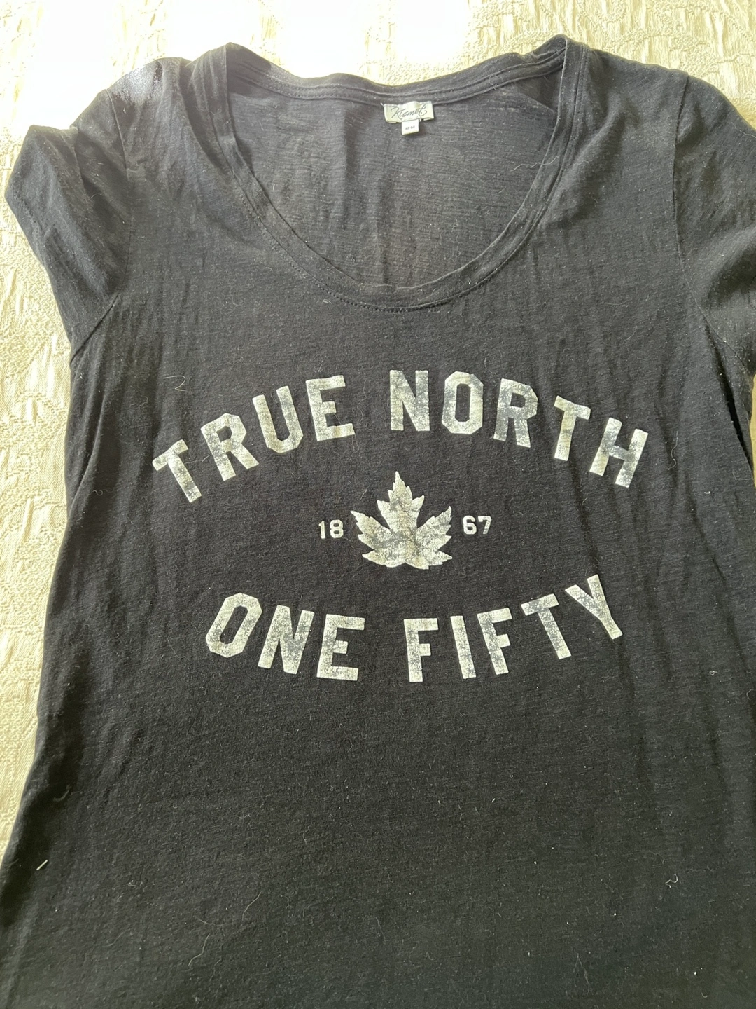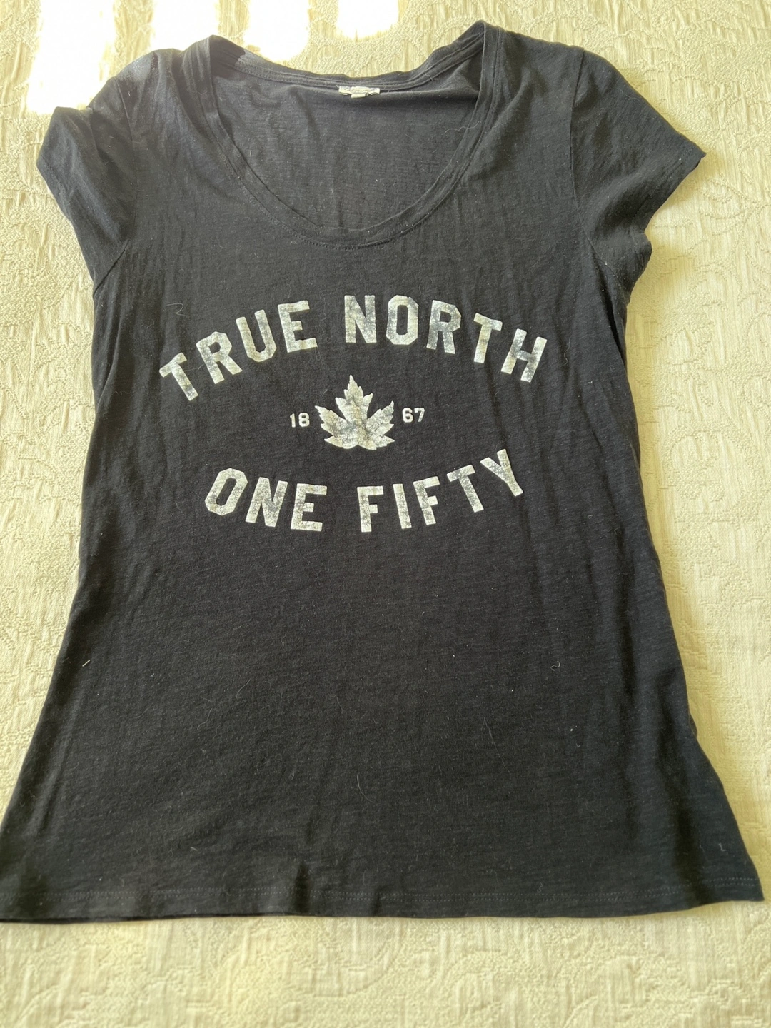 Black Kismet t-shirt, size medium. Features a True North One Fifty graphic. 50% cotton, 50% modal. Made in Cambodia. Machine wash inside out with similar colours.