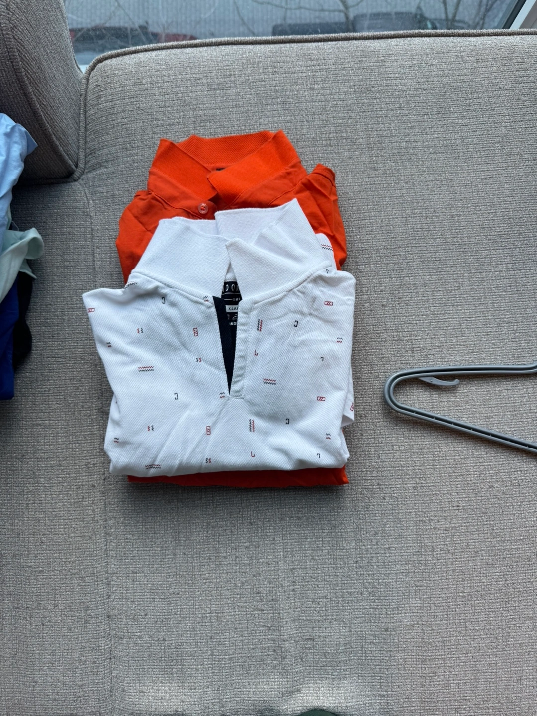Bundle of two men's polo shirts. One orange, one white with a geometric pattern. Size says X-Large but fit is large.