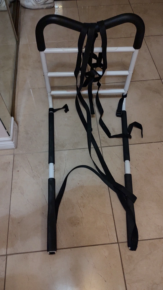 49White metal bed rail with padded black hand grips. Includes multiple black straps. For added safety and support.