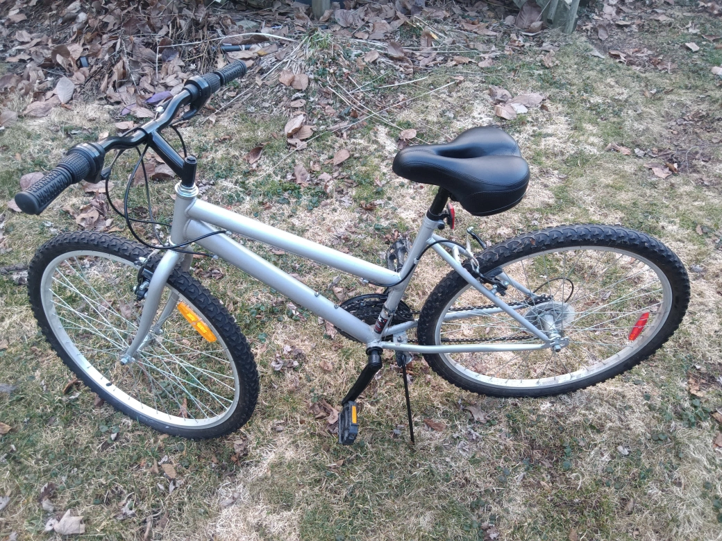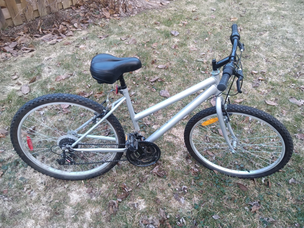 Silver women's mountain bike. Only problem is that the front tire goes flat. Everything else works fine. Has a seperately purchased and extremely comfortable bike seat. (seriously...)