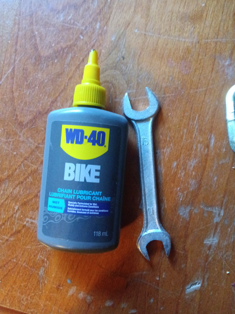Comes with bottle of WD-40 Chain Lubricant and wrench.