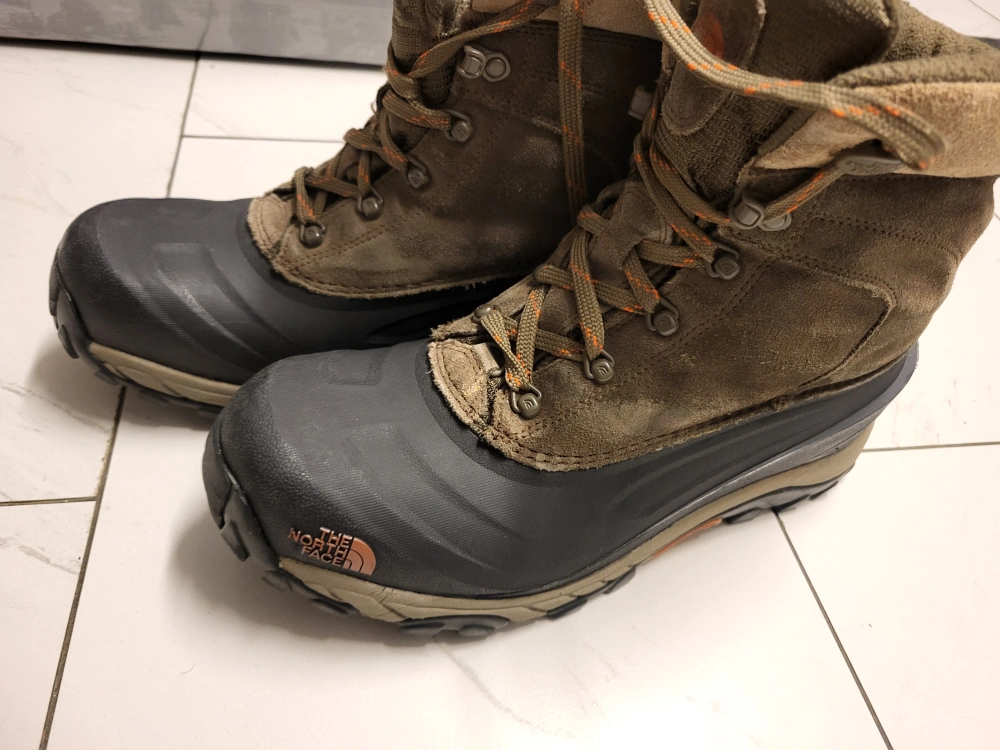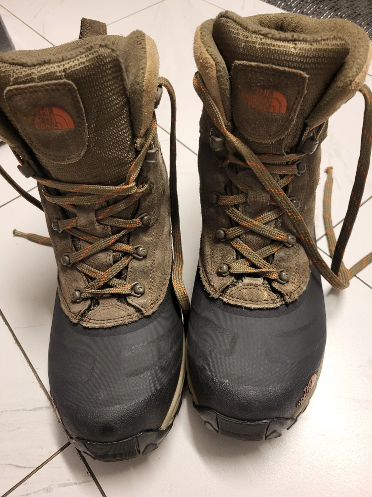 Men's winter boots. Olive green suede and textile upper. Orange accents. HeatSeeker 200G insulation. Size US 9.5, UK 8.5, EU 42.5, CM 27.5. Good for snow and cold weather.