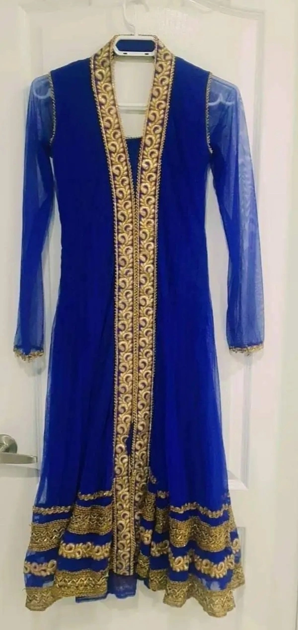 Stunning royal blue Anarkali suit. Features gold embroidery detail. Long sleeves. Floor length. Semi-sheer overlay. Beautiful for special occasions.
