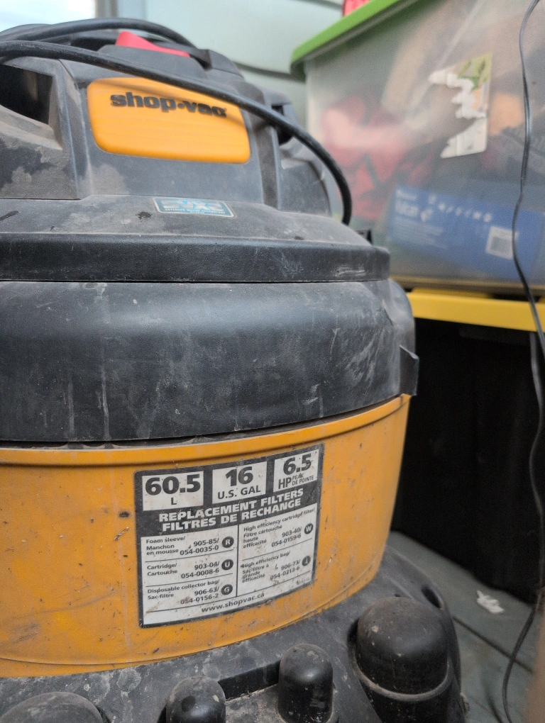 Shop-Vac wet/dry vacuum. 60.5 Litre capacity, 16 US gallons, 6.5 peak HP. Replacement filters available.
