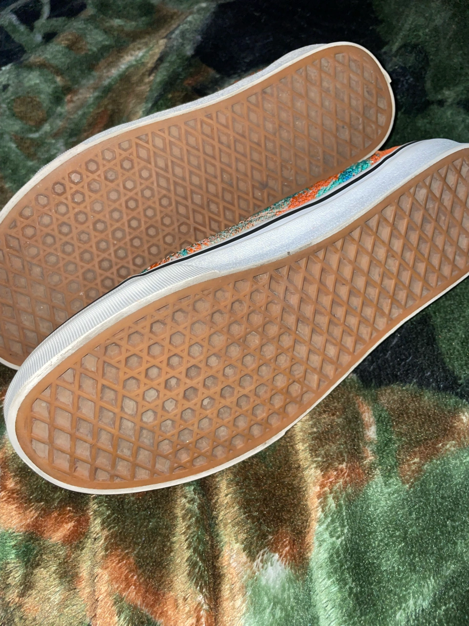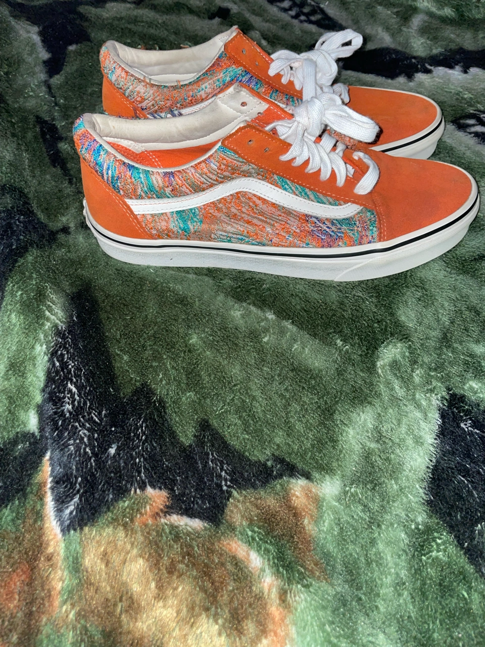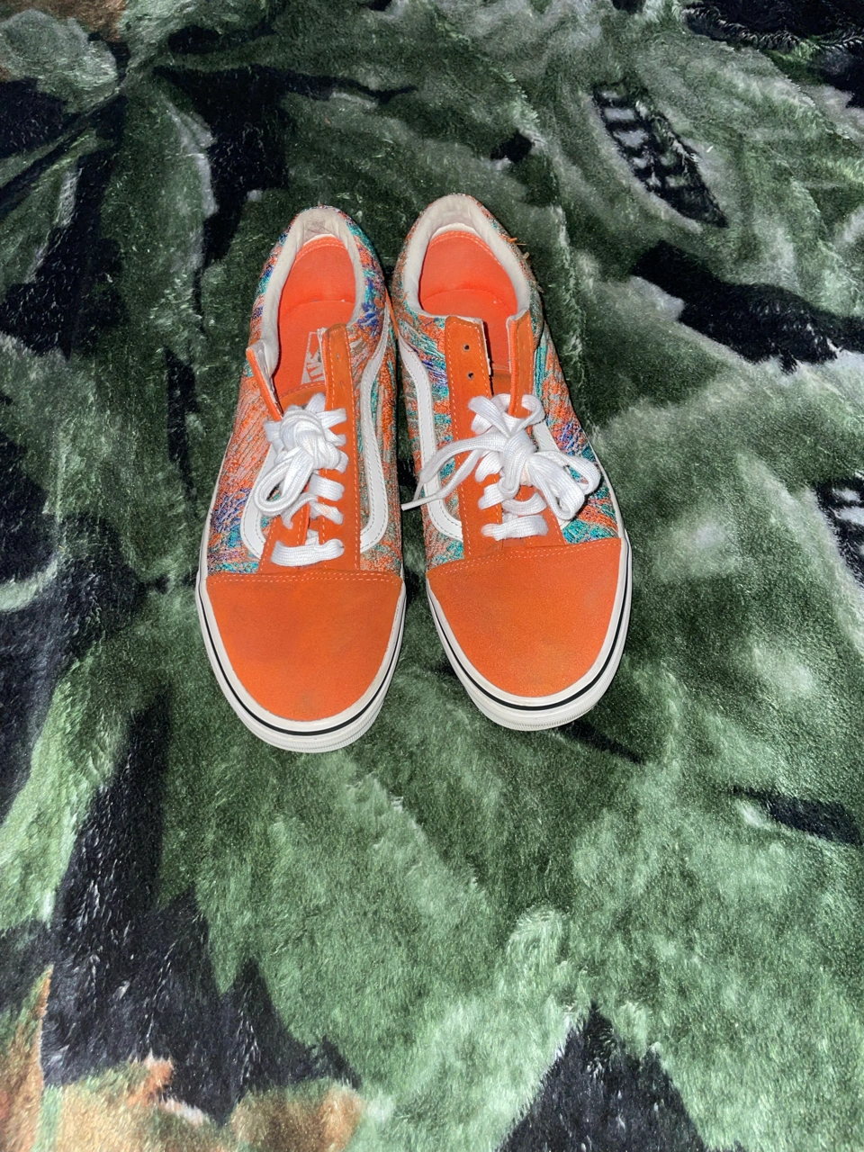 Vans Old Skools. Orange and teal tie-dye pattern. Low-top design. White laces. Waffle sole. Pre-owned.