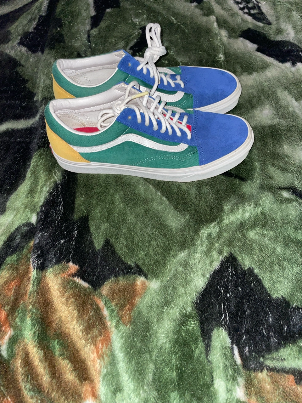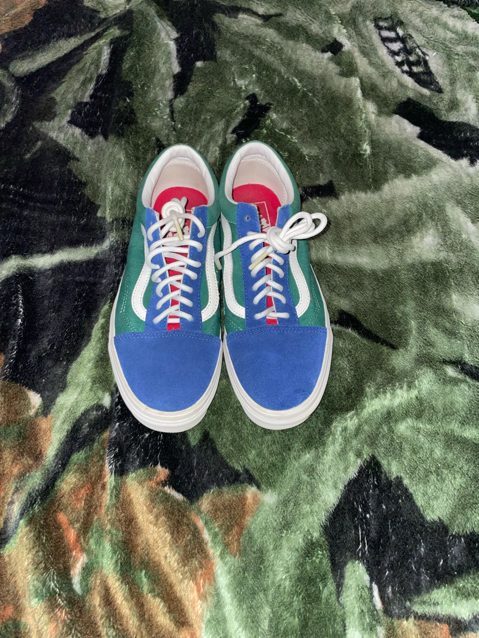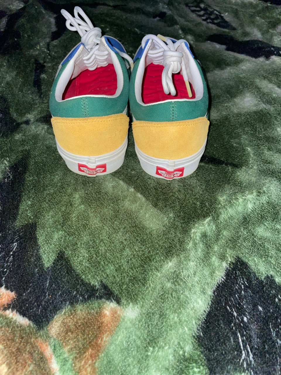 Men's Old Skool sneakers. Multicolored suede and canvas upper. White midsole. Classic Vans design. Lace-up closure.