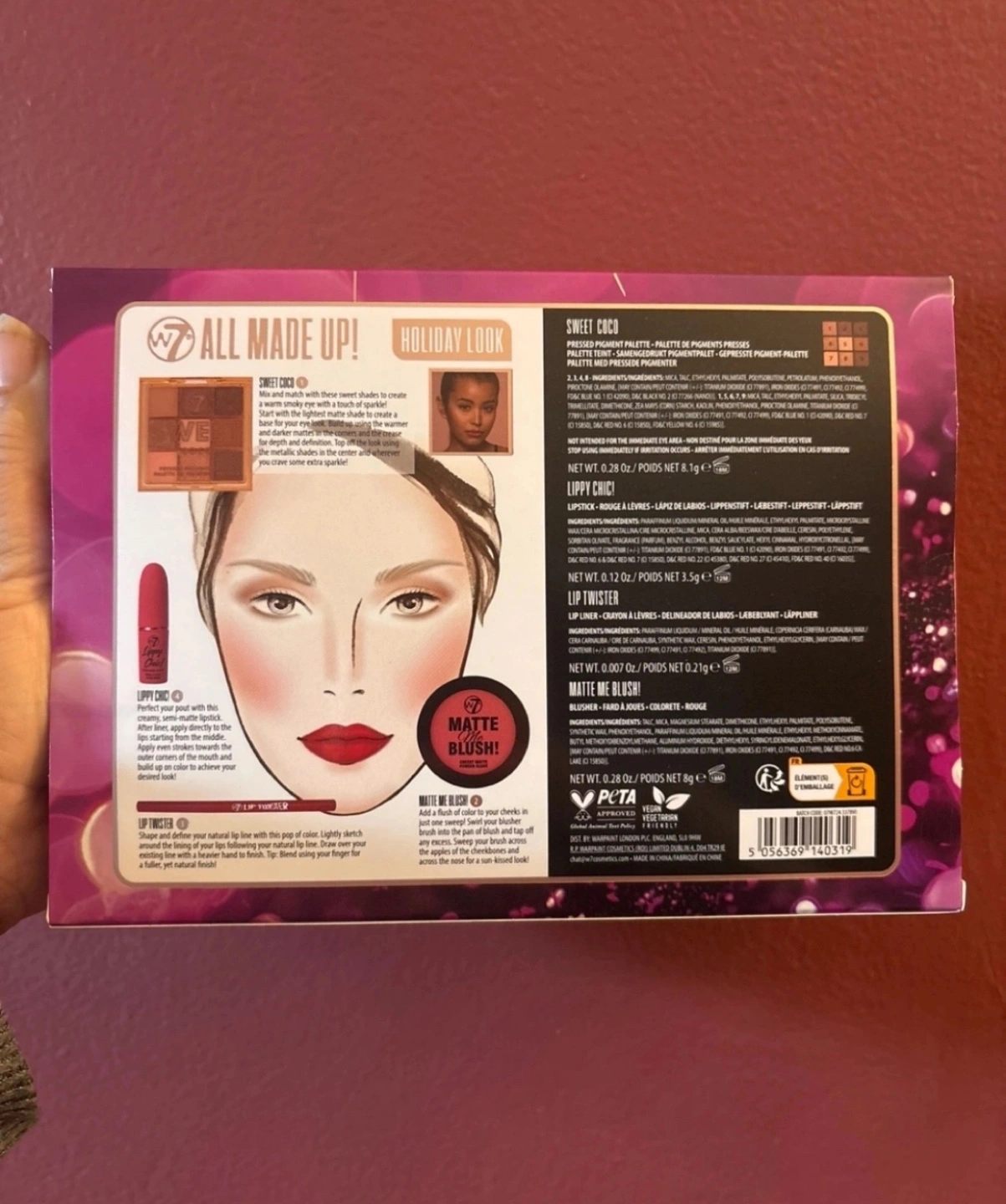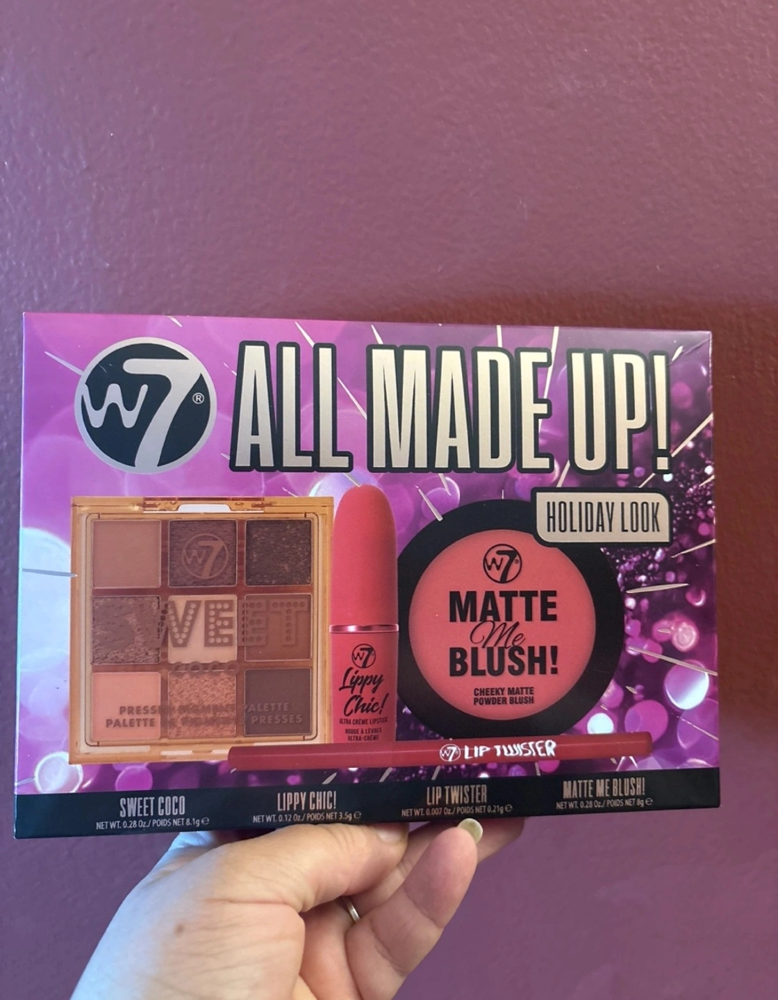 New W7 Cosmetics All Made Up Holiday Look makeup set. Includes eyeshadow palette, lipstick, lip liner, and blush. Perfect for holiday makeup looks. New