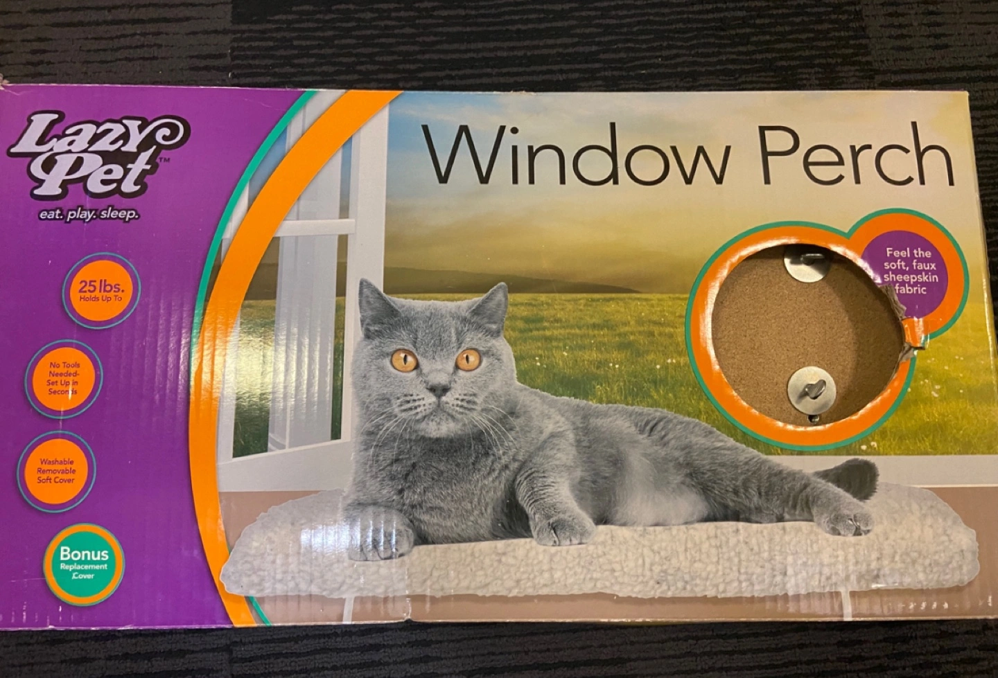 New Lazy Pet window perch for cats. Holds up to 25 lbs. Features a washable, removable soft cover. Haven’t had pets for some time now.