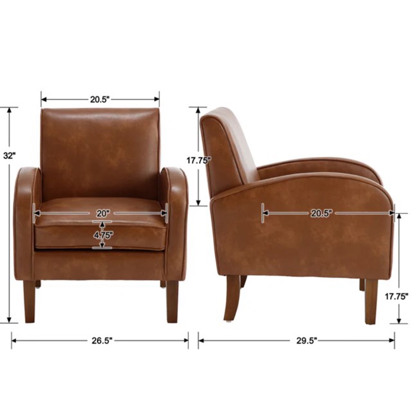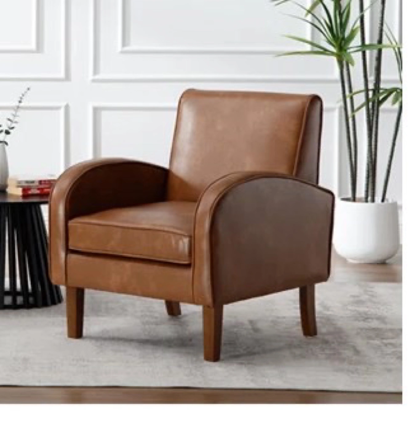 Stylish brown faux leather accent chair. Comfortable seating. Mid-century modern design. Wooden legs. Great addition to any living room. Never been used.