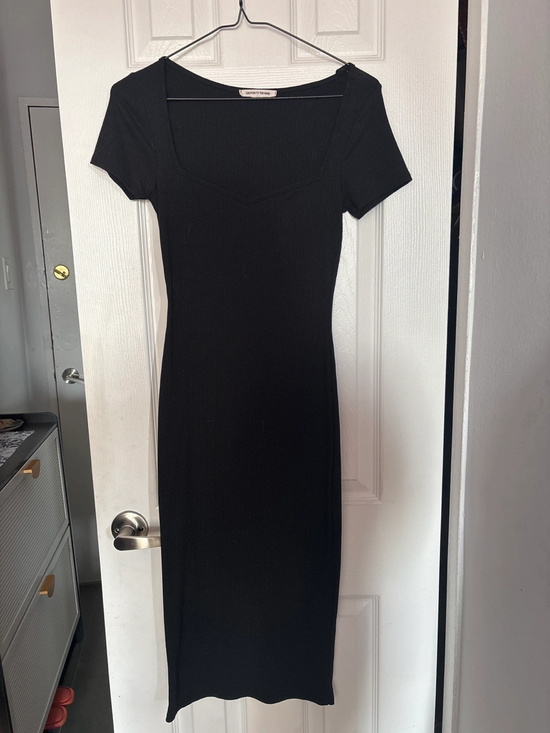 Black ribbed midi dress. Square neckline. Short sleeves. Form-fitting silhouette. Excellent for any occasion.
