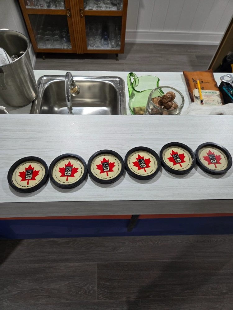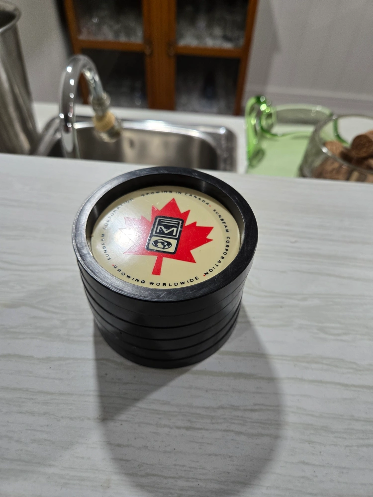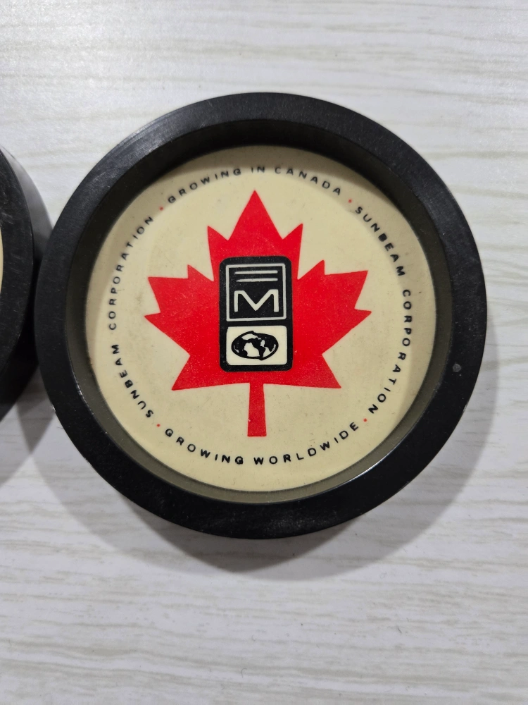 Six vintage coasters. Black plastic frames. Red maple leaf design. Sunbeam Corporation logo. Growing in Canada. Growing worldwide.