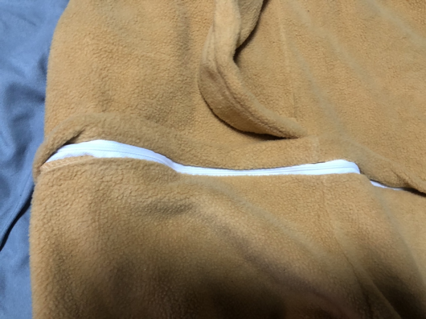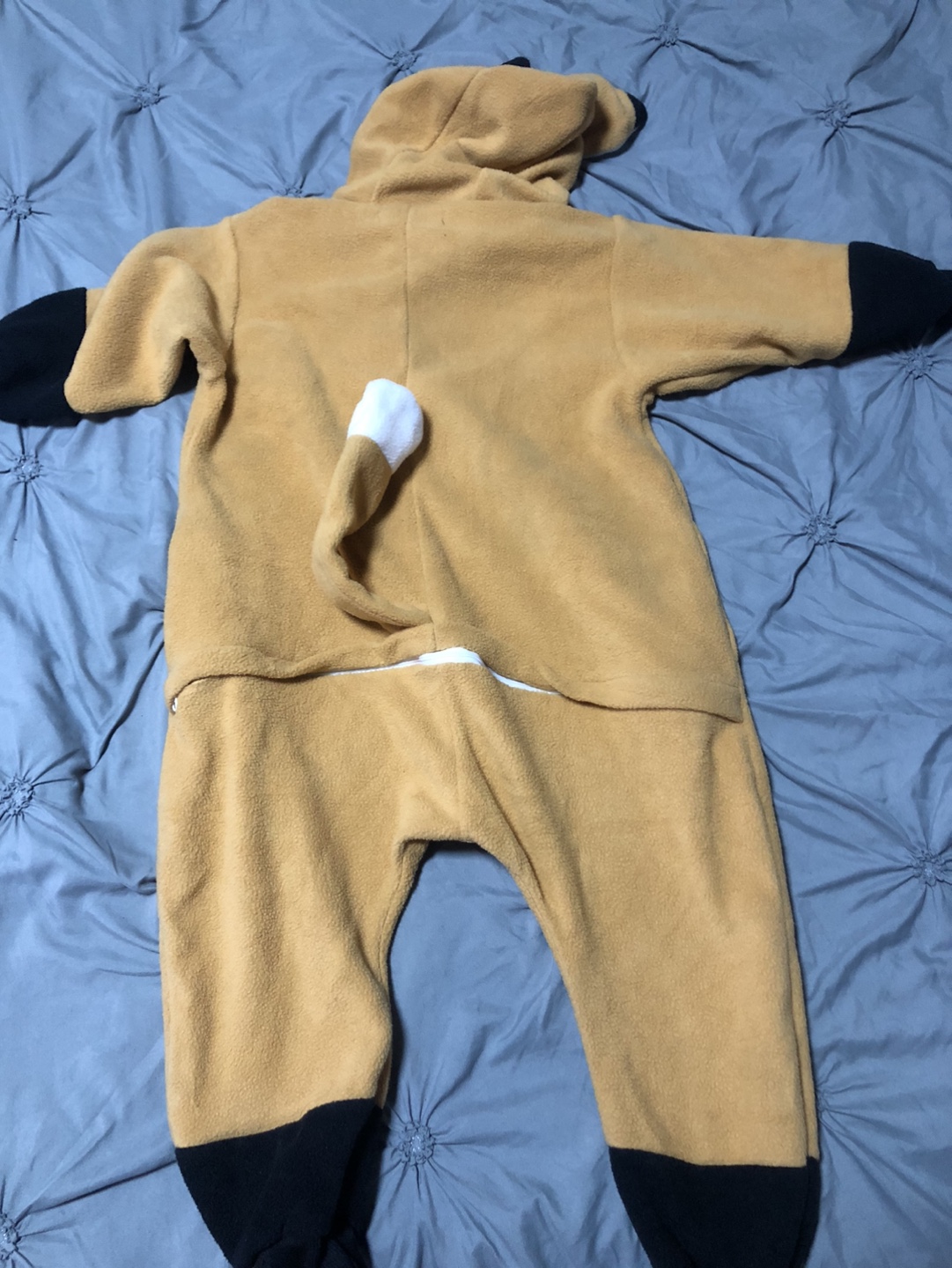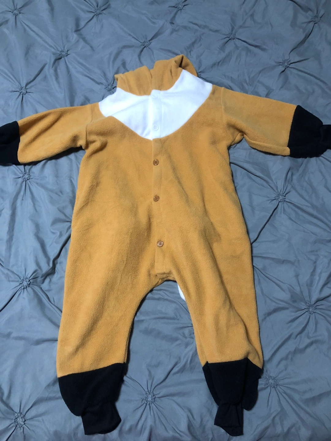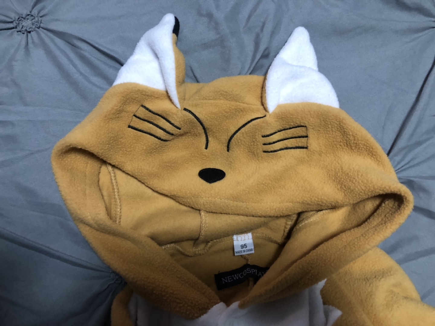 Cute fox onesie. Size 95. Good for 2-3 yr old. Features a hooded design with fox ears and face. Full-length zipper. Soft fleece material.