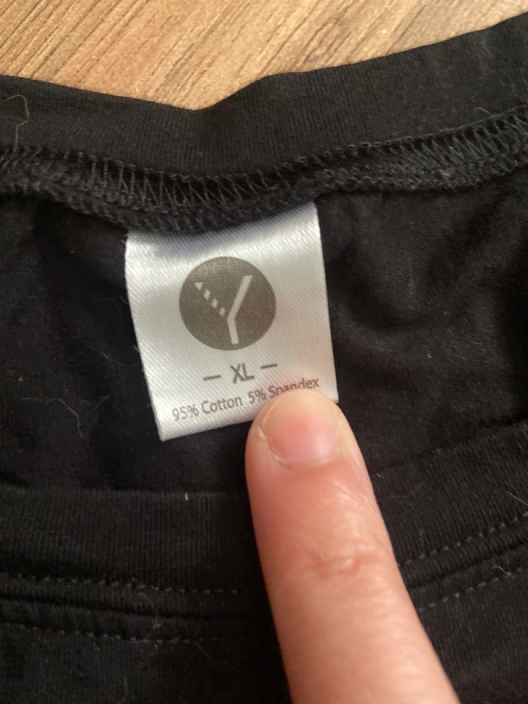 Black cotton blend t-shirt. Features a white graphic print. Size XL. 95% cotton, 5% spandex.