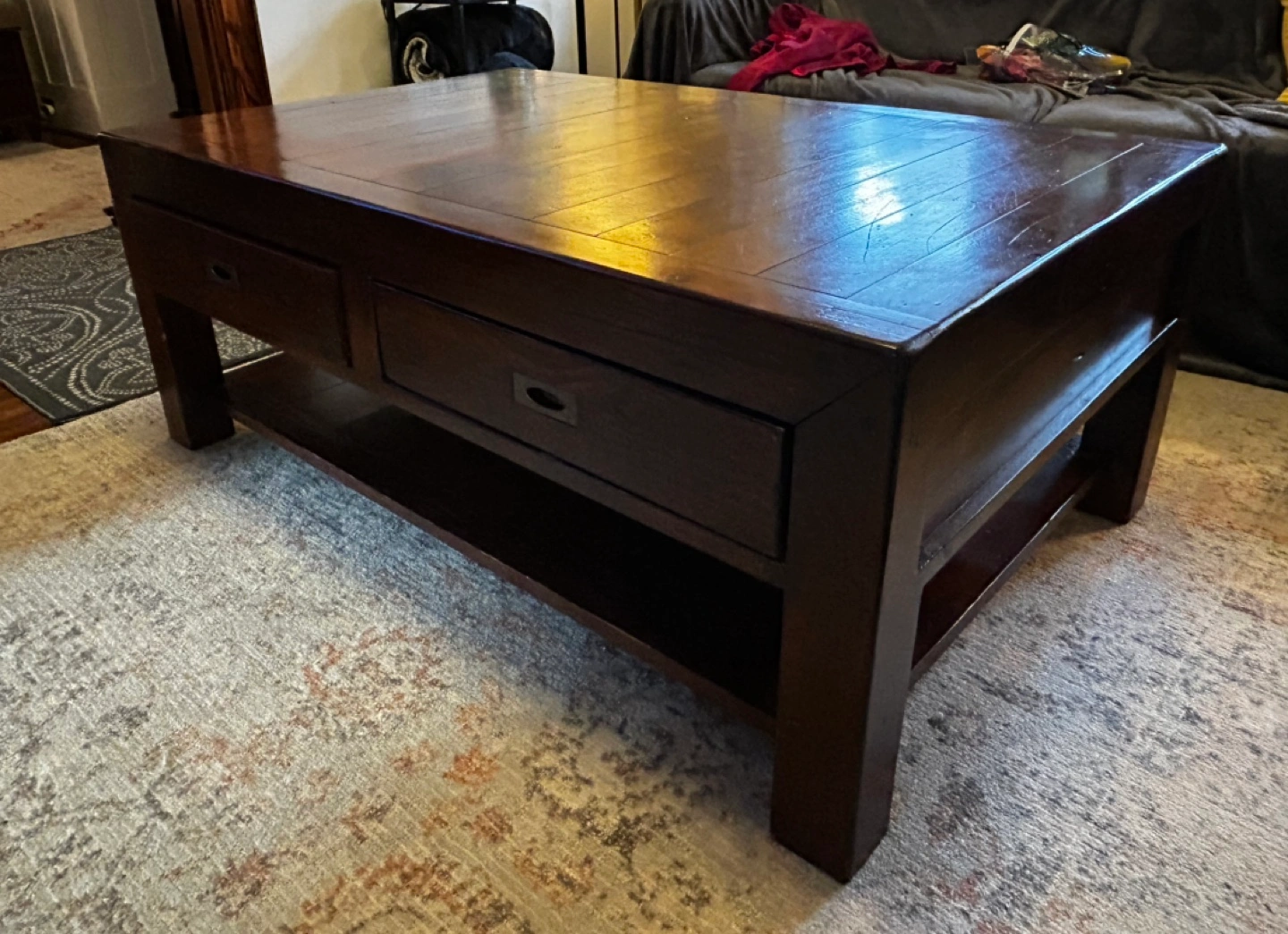 - Solid hardwood coffee table, with full shelf underneath and two, large pass-through drawers with metal hardware.